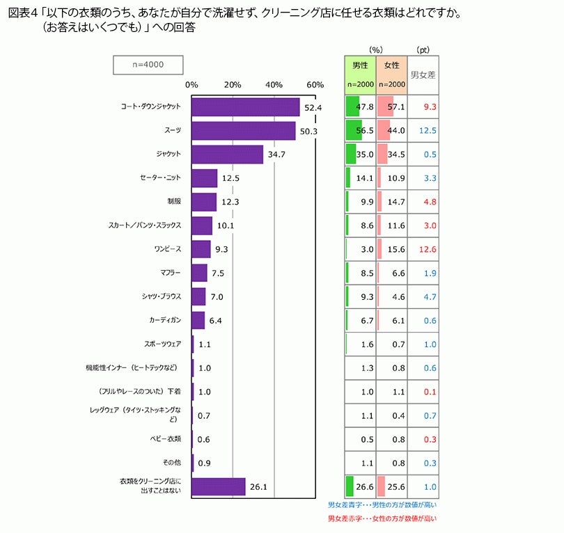 図表3と図表4を見比べると、図表3のほうが、女性の割合が高い項目が多いことが目につきます。クリーニング店に任せるものはそれほど男女に差はないが、自宅でのお手入れには男女で差があると言えそうです。