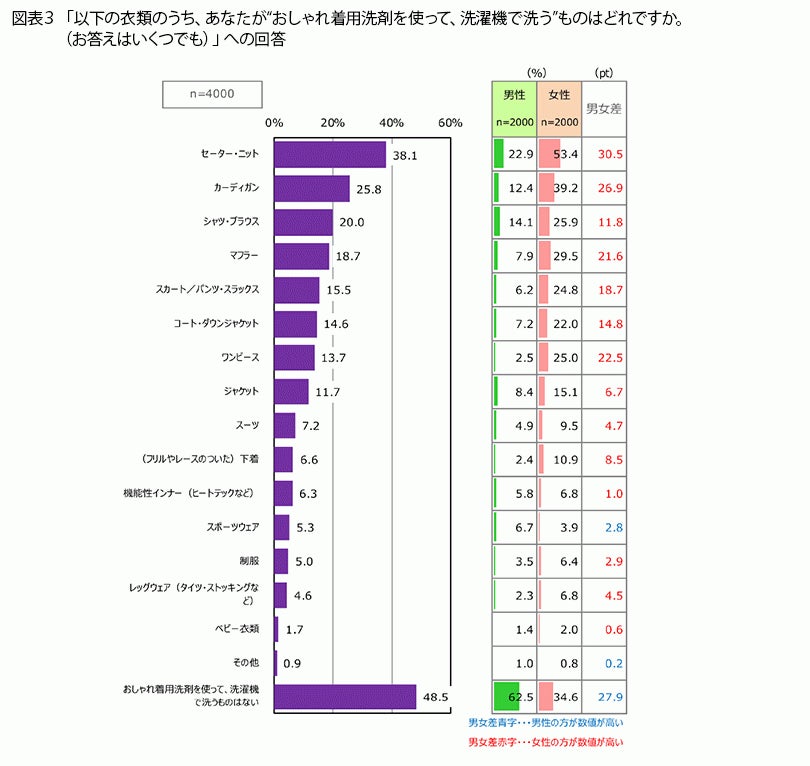 おしゃれ着用洗剤を使って、洗濯機で洗うもの(図表3)、自分で洗濯せず、クリーニング店に任せるもの(図表4)を聞きました。