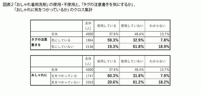 服についている注意書きのタグを気にする人や、おしゃれに気をつかっている人は、おしゃれ着用洗剤を使用している人が多い傾向にあるようです(図表2)。タグの注意書きを気にしている人と気にしていない人、おしゃれに気をつかっている人と気を使っていない人を比べると、どちらとも、おしゃれ着用洗剤を使用していると回答した割合が約40ポイントも差がついています。