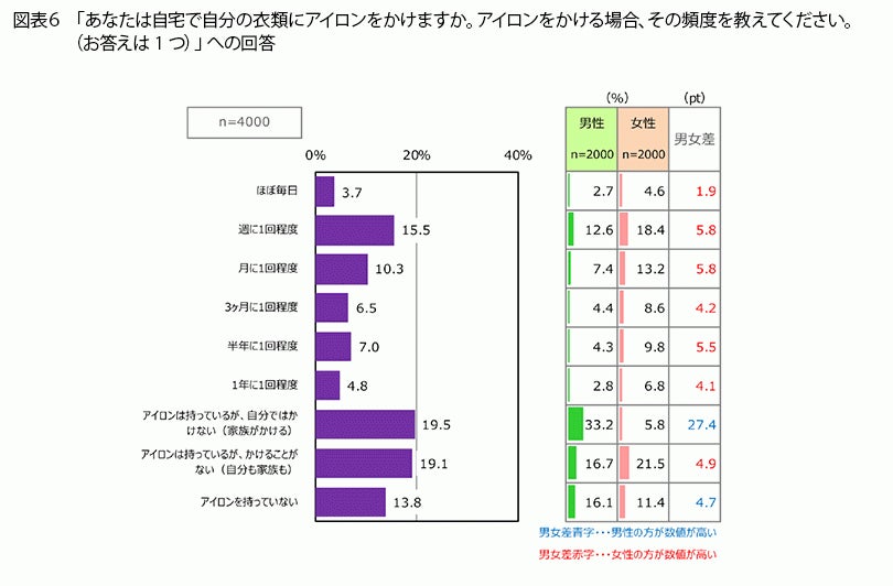 自宅で自分の衣類にアイロンをかけるか聞いたところ(図表6)、「アイロンを持っていない」という人が13.8%いました。自宅にアイロンがあって、自分でアイロンをかける人のなかで、最も多かったのが、「週に1回程度」(15.5%)でした。