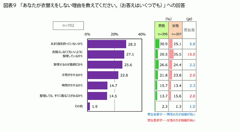 衣替えをしない人に、その理由を聞くと(図表9)、最も割合が高かったのが「あまり服を持っていないから」(28.3%)でした。また、「衣替えしなくてもいいように整理しているから」(27.1%)の次に割合が高いのが「整理するのが面倒だから」(25.6%)でした。真逆の回答が2位と3位に並んでいるのはなかなか興味深いのではないでしょうか。