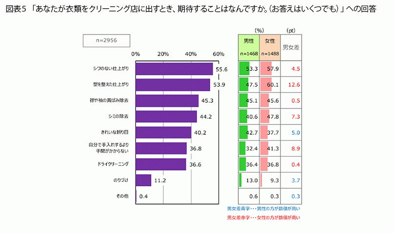図表4では、「衣類をクリーニング店に出すことはない」と回答した人が26.1%いましたが、残りの7割強の人たちは、クリーニング店を利用するとき、どんなことを期待しているのでしょうか(図表5)。