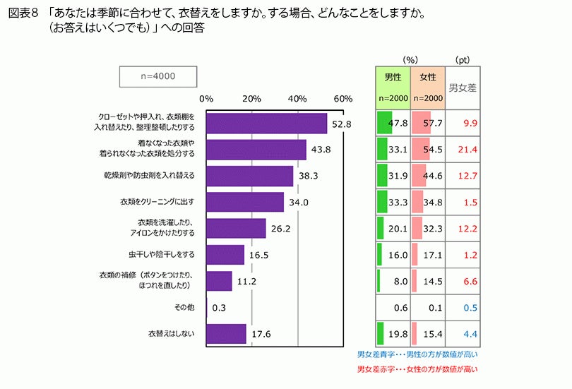 一般的に6月や10月に行うことが多い衣替えですが、衣替えをするかどうか、どんなことをするかを聞くと(図表8)、「クローゼットや押入れ、衣類棚を入れ替えたり、整理整頓したりする」(52.8%)、「着なくなった衣類や着られなくなった衣類を処分する」(43.8%)、「乾燥剤や防虫剤を入れ替える」(38.3%)がトップ3でした。それと比べると、衣替えの時期に、クリーニングに出したり、洗濯したり、アイロンをかけたりする人は少ないようです。