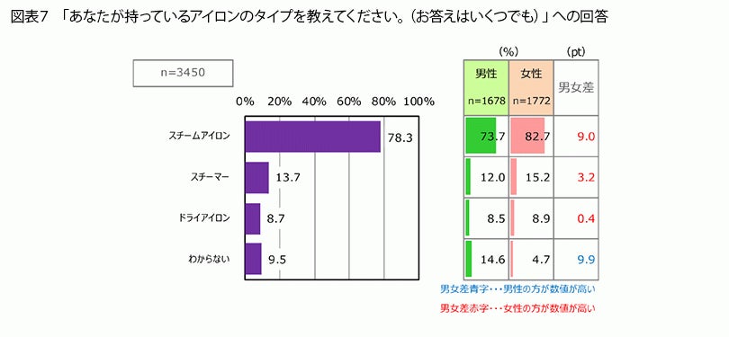 また、持っているアイロンのタイプを聞くと(図表7)、アイロン台などを利用して、プレスとスチームでシワをのばす「スチームアイロン」が78.3%とダントツで高く、「スチーマー」(アイロン台を利用せず、ハンガーなどにかけたままシワをのばすタイプ)や「ドライアイロン」(スチーム機能がついていないタイプ)はあまり普及していないことがわかります。