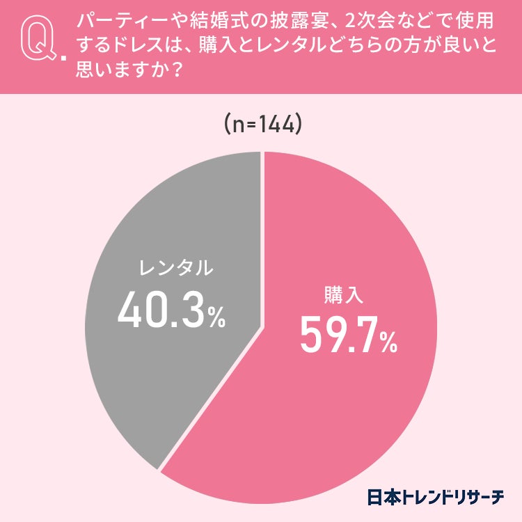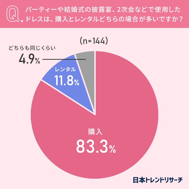 今回はDRENi(ドレニ)と共同で、事前調査で「パーティーや結婚式の披露宴、2次会などに参加したことがある」と回答した40代以下の女性144名を対象に、「ドレスの購入とレンタル」に関するアンケートをおこないました。