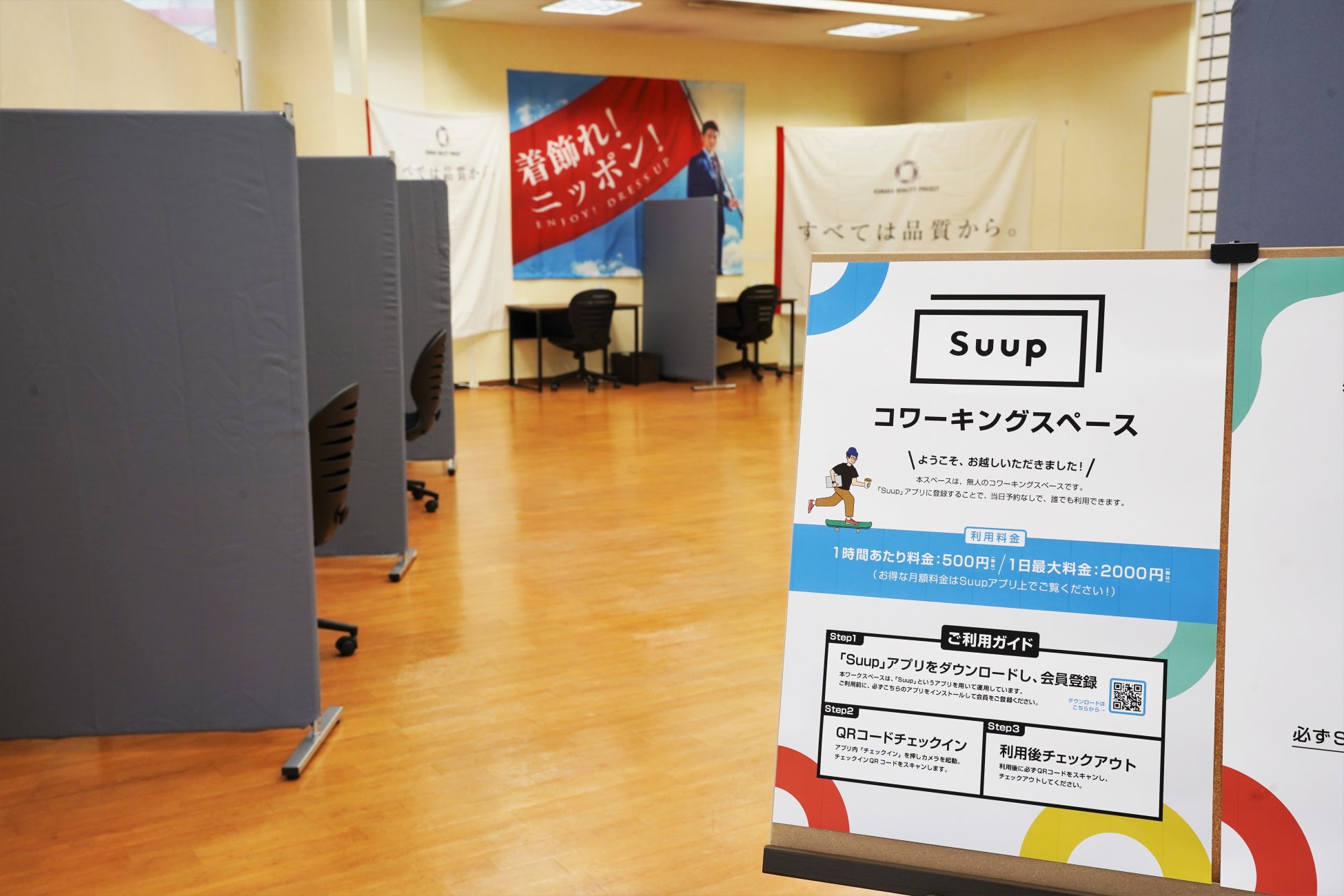 Suupは無人運営システムとノウハウを活用し、空きスペースをワークプレイスとして完全無人で運営ができるよう開業から運営、集客までワンストップでサポートをしています。この度、コナカと連携し、コナカ店舗の一部スペースを有効活用しワークプレイスに転換する取り組みを開始いたしました。
