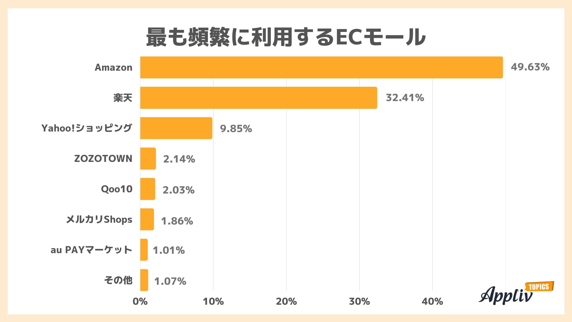 年に1回以上利用しているECモールの中で、最も頻繁に利用するECモールを聞いたところ、1位は「Amazon」で49.63%。回答者の約半数がAmazonを最も頻繁に利用しています。