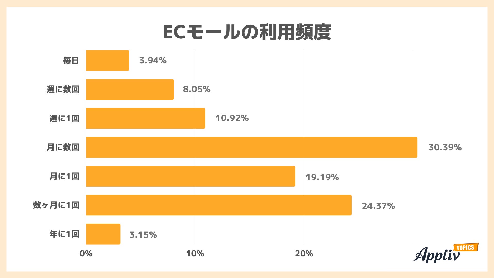 ECモールを年1回以上利用している1,777人に、最も頻繁に利用しているECモールの利用頻度を聞いたところ、最も多かったのは「月に数回」で30.39%、次いで「数ヶ月に1回」が24.37%という結果になりました。