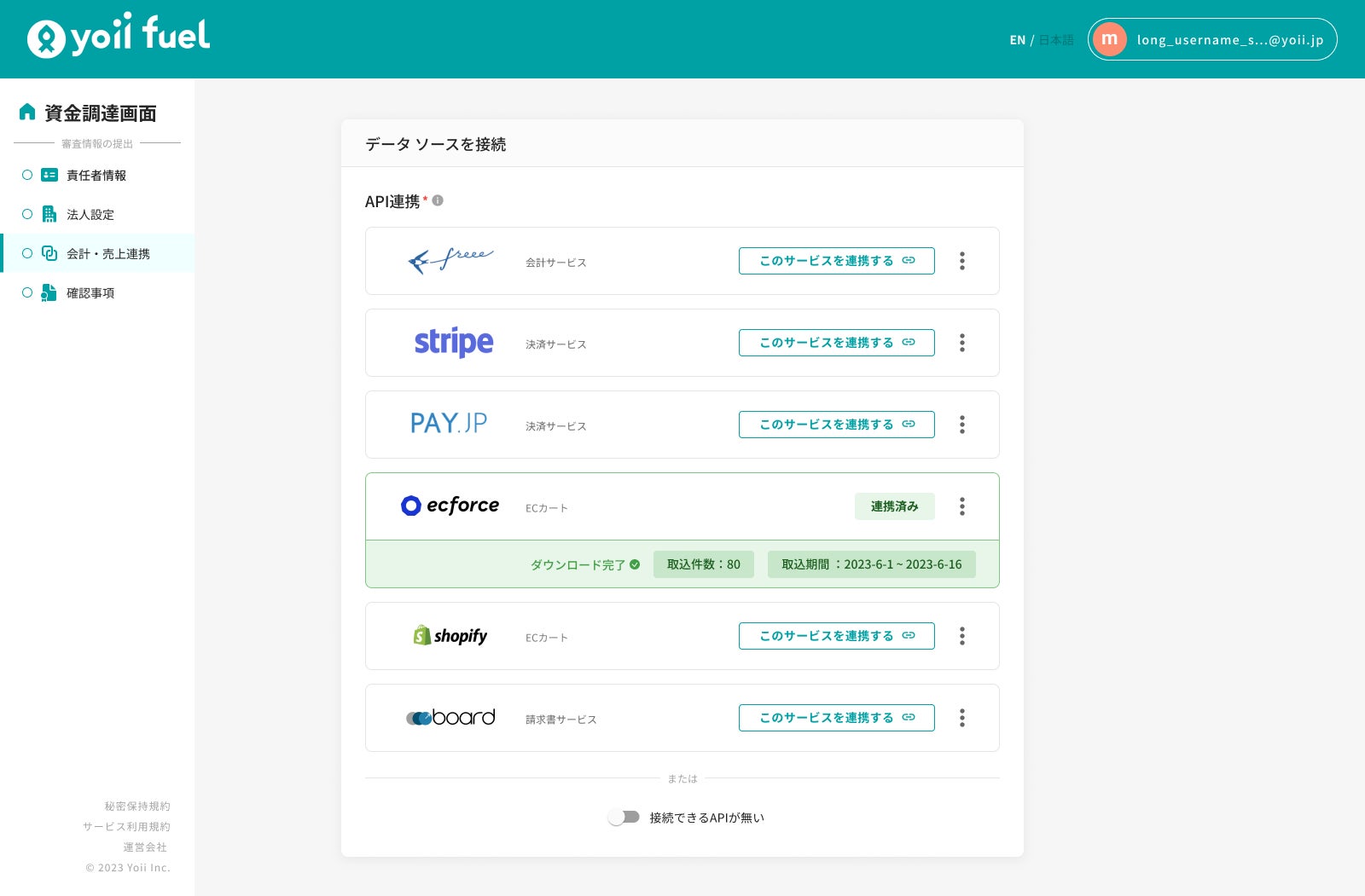 今回のAPI連携により、「ecforce」から取引データが自動取得できるようになり、「ecforce」ユーザーの利便性が大幅に向上します。また、「Yoii fuel」はより精度高く、効率的に審査業務が可能となります。これにより、EC事業を営むスタートアップはより手軽かつスピーディーに資金調達できるようになります。