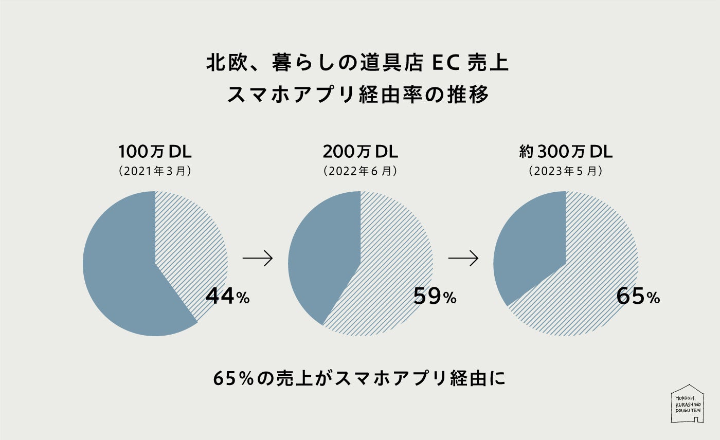 株式会社クラシコム(本社:東京都国立市、代表取締役:青木耕平)が提供するライフカルチャープラットフォーム「北欧、暮らしの道具店 (URL:https://hokuohkurashi.com/ )」のスマホアプリ(iOS・Android)が、2020年4月のAndroid版提供開始から、約3年で300万ダウンロードを突破したことをお知らせします。併せて、EC売上におけるスマホアプリ経由の割合が年々増加し直近65%に達する等の売上への影響や、当社初マーケティングチームの発足、過去最高ダウンロードを記録した2023年4月放送のテレビ番組「カンブリア宮殿」の効果など、リリース3年を超えてもペースを落とすことなくダウンロード数を積み重ねてきたその背景をまとめました。