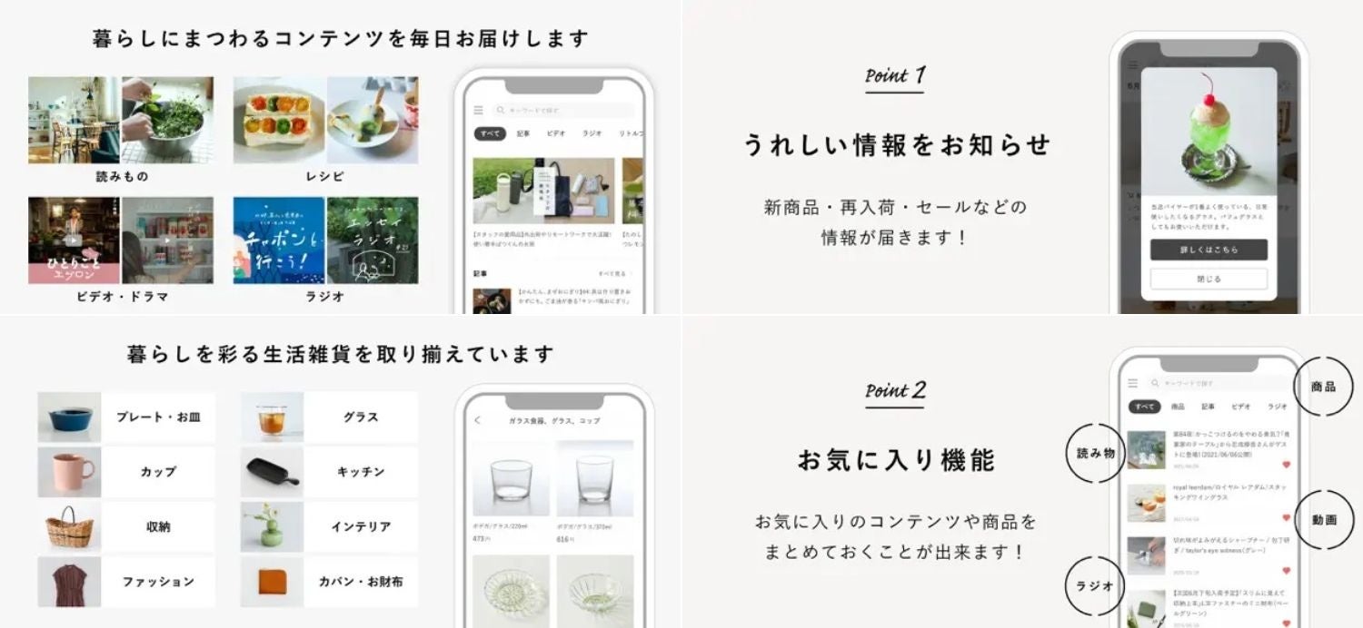 特徴: アプリ上で商品の購入から、ウェブ記事や動画・音声コンテンツの視聴などをシームレスに利用することができます。スマホアプリでは、全コンテンツを一覧化してブックマークできる 「お気に入り機能」を搭載しています。気になる商品を登録し て後からじっくり検討したり、動画コンテンツで作ってみたいレシピを保存したりすることで、“暮らし”に関連する様々なコンテンツを楽しむことができます。
