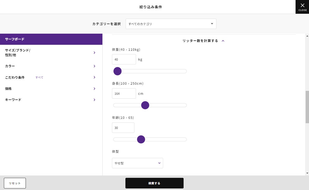 従来のカタログサイトでは難しかったサーフボード選びを解決する「サーフボードリッター計算機能」を搭載しています。身長・体重、海へ行く頻度やお好みの波のタイプを選択するだけで、サーフボード選びには欠かせないサーフボードのボリュームを表す「リッター」を自動計算します。初心者や初めてサーフボードを購入される方でも、自身の体型やレベルにあったアイテムを探せる便利な機能です。