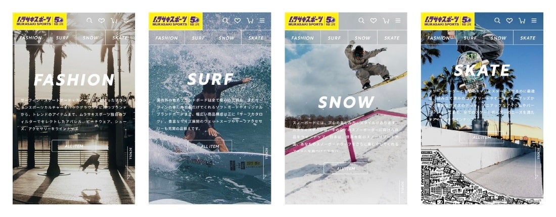 また、今回のムラサキスポーツのオンラインストアのリニューアルでは、W2のグループ会社である、ECに特化したデザイン制作会社「ブランデックス株式会社」の精鋭デザイナー陣が、フロントデザインを手がけました。購買を含むUX(User Experience)設計にもこだわり、機能面とデザイン面の双方において、日本のアクションスポーツのリーディングカンパニーであるムラサキスポーツらしさを追及したECサイトデザインに仕上がりました。