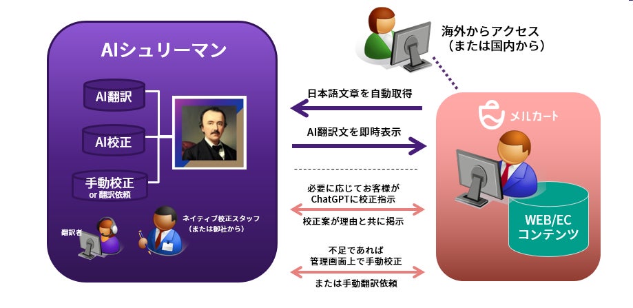 販促・CRM機能一体型のSaaS型ECカートシステム「メルカート」を提供している株式会社エートゥジェイ(本社:東京都港区、代表取締役社長:飯澤 満育)は、多言語ビジネス支援を行うWIPジャパン株式会社(本社:東京都千代田区、代表取締役社長:上田輝彦)が提供する、日本で初めてChatGPTを活用、AI翻訳およびAI校正機能を搭載したサイト翻訳サービス「AIシュリーマン」とシステム連携したことをお知らせします。