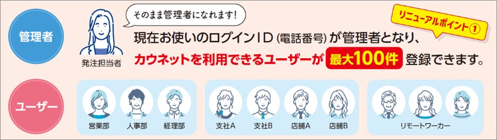 現在ご利用いただいているログインID(登録電話番号)のお客様ご自身が管理者となり、管理者と同一法人の方(支社・営業所・社員等)を最大100件まで「ユーザー」として登録できるようになりました。
