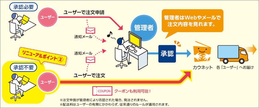 この機能では、ログインIDを管理者として、その下にカウネットECサイトを利用できるユーザーを登録することができます。ユーザーが商品を注文すると管理者に通知が届き、管理者が承認することで注文が完了する仕組みです。