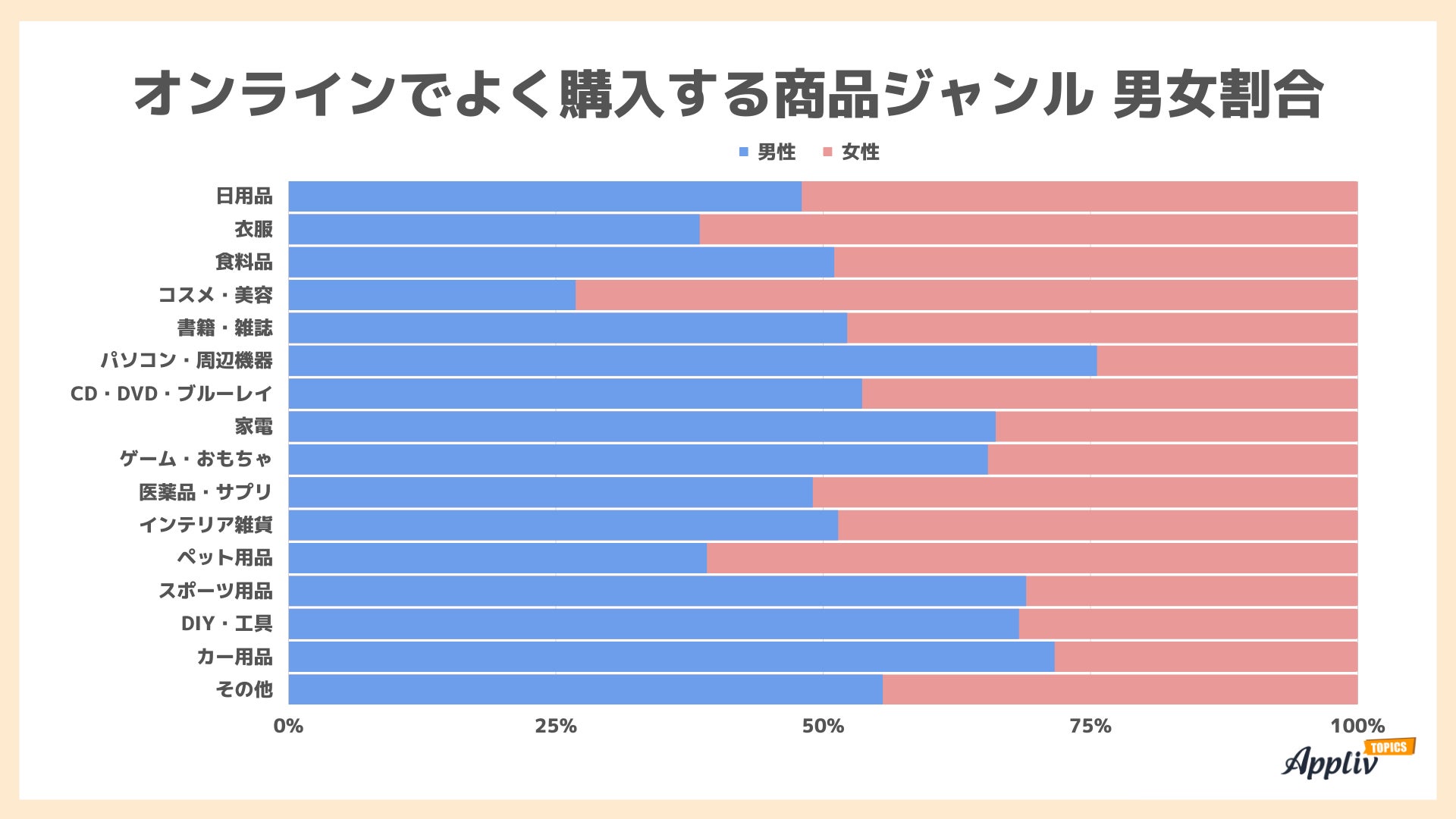 - 女性はコスメやファッション、男性はガジェットや趣味関連を購入する傾向。