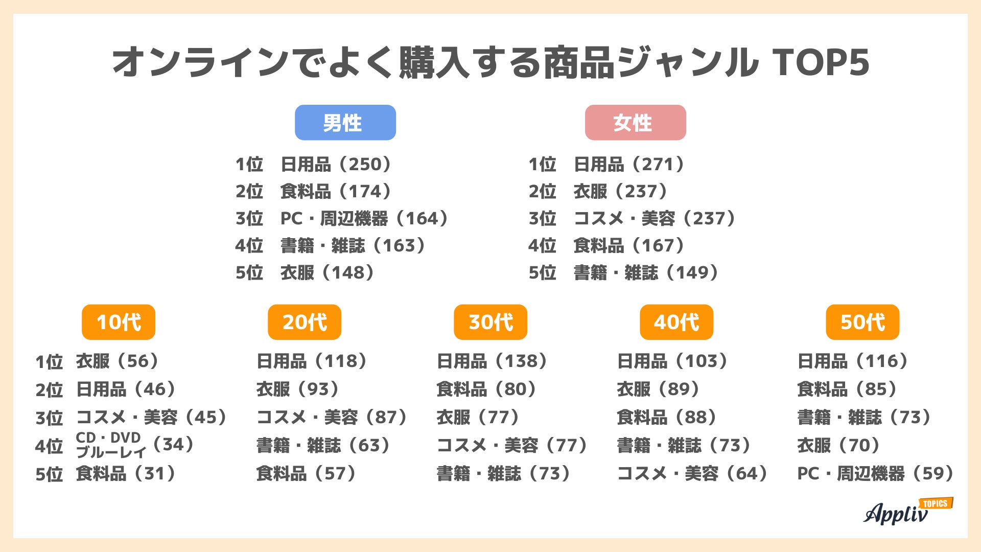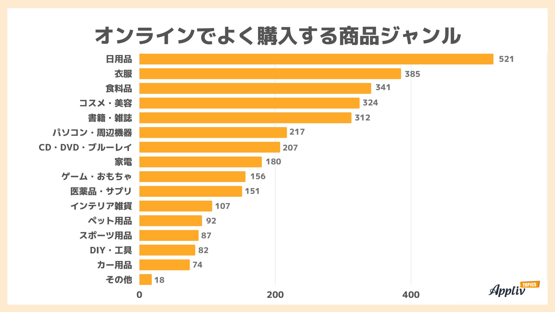 - オンラインでよく買う商品ジャンルは「日用品」「衣類」「食料品」。
