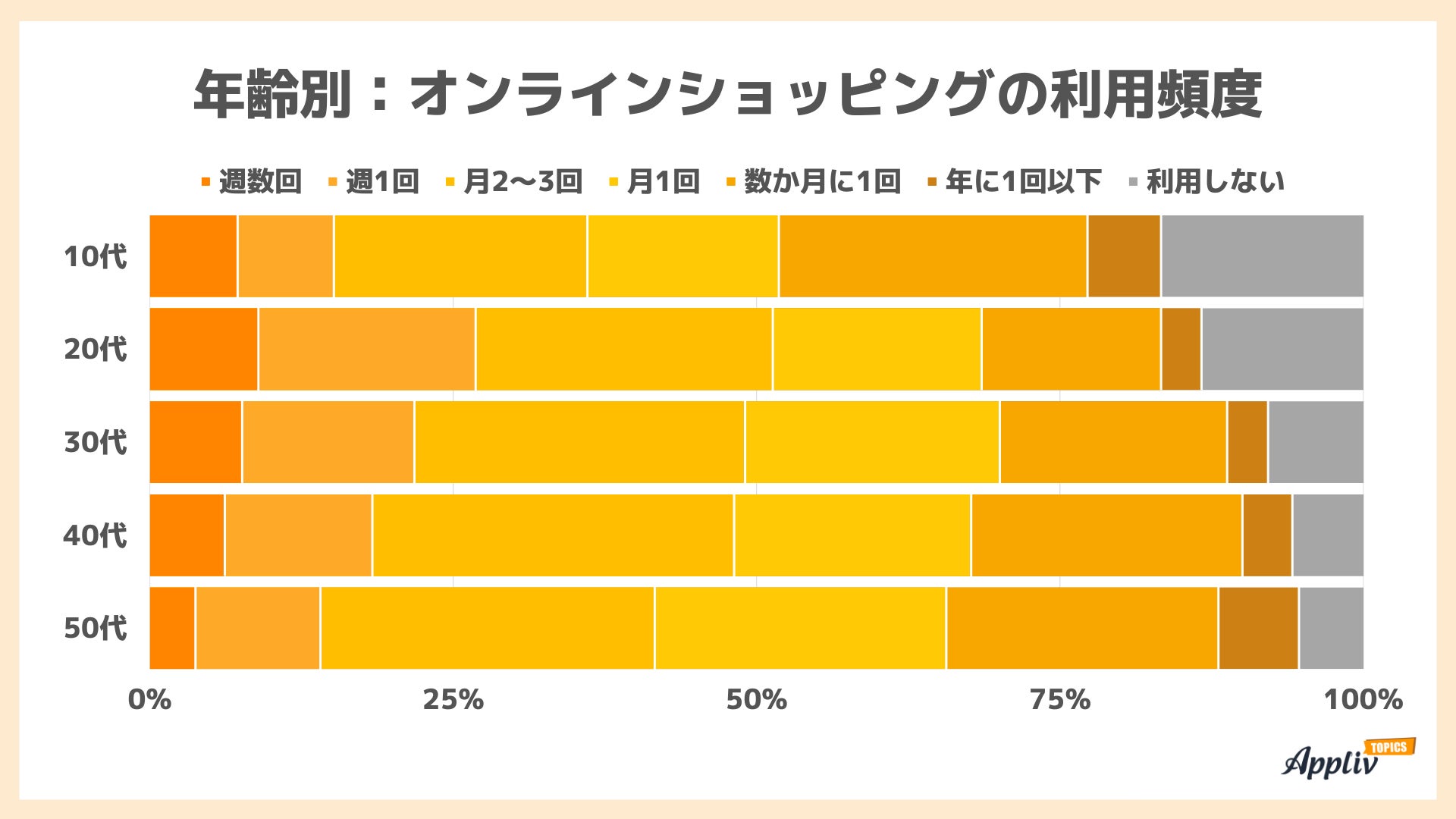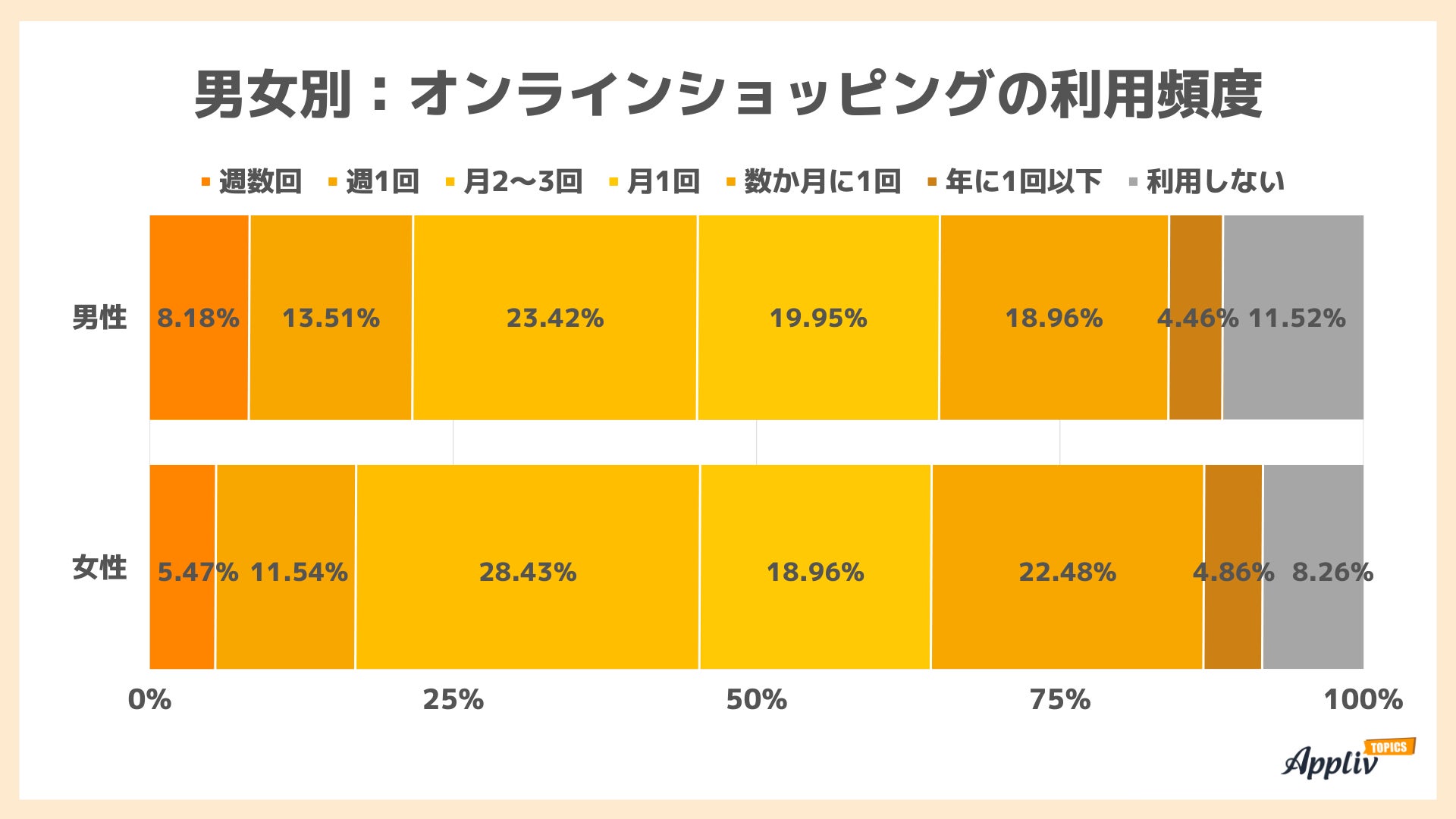 また、「数ヶ月に1回」の割合は女性の方が高く、「利用しない」の割合は男性の方が大きいです。オンラインショッピングのヘビーユーザーは男性が多いですが、オンラインショッピングそのものの利用率は女性の方が高いようです。
