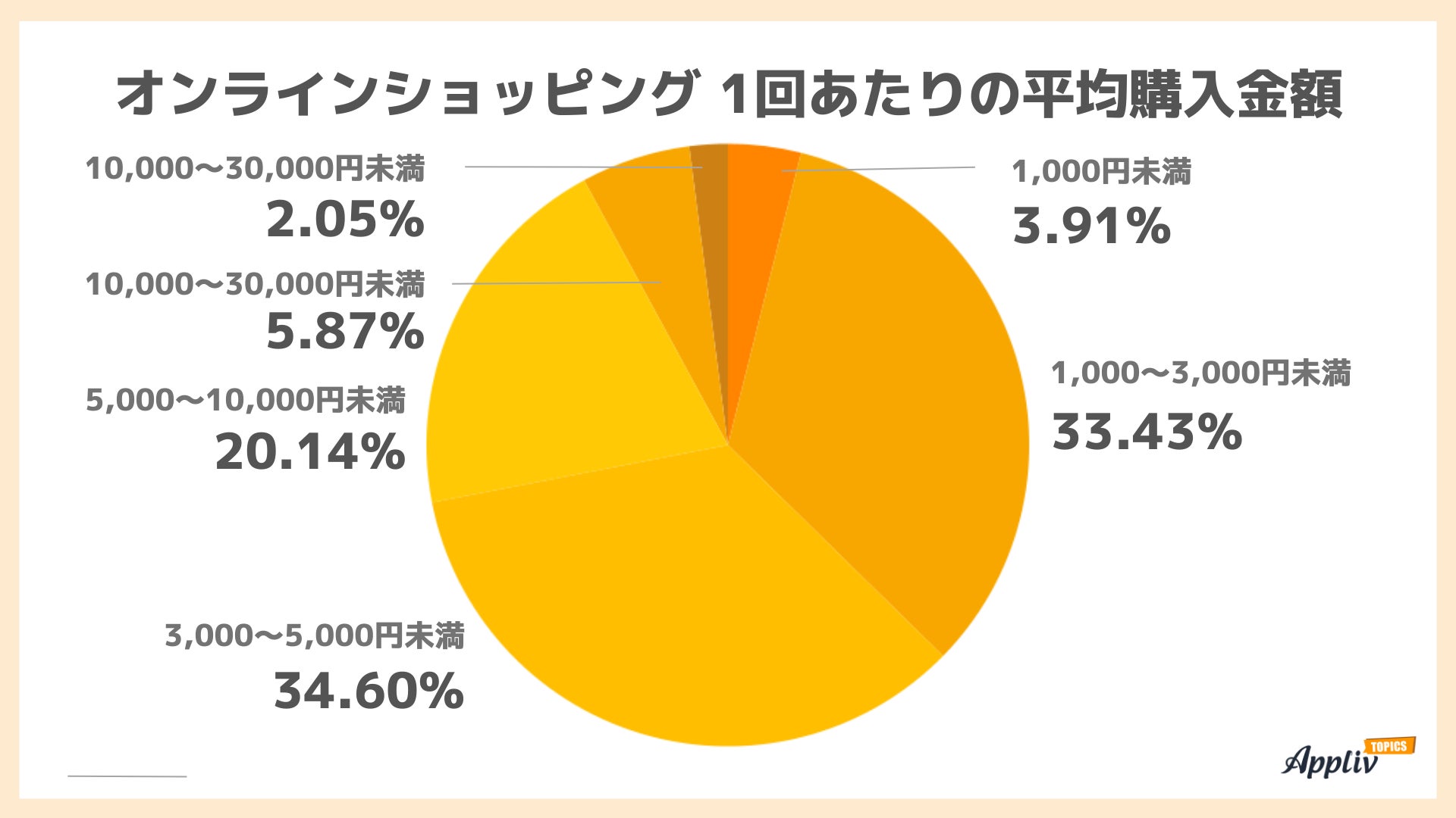 月1回以上オンラインショッピングを利用している1,055人に、1回あたりの平均購入金額を尋ねました。「わからない(32人)」以外の回答の割合を見ると、最多は「3,000~5,000円未満」で34.60%。僅差で「1,000円~3,000円未満」が33.43%でした。