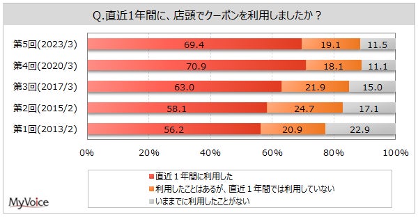 一方で「月2~3回」「月1回」「数ヶ月に1回」「年に1回以下」の割合は30代以上で増加。「利用しない」の割合は年代が上がるほど小さくなっています。また、10代の「数ヶ月に1回」の回答の割合が大きいのも特徴的です。