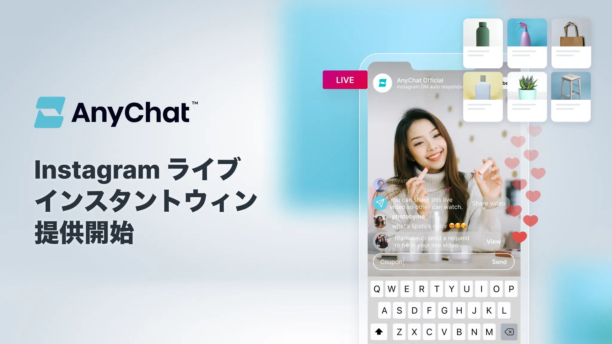 今回、本取り組みのさらなる強化に向けて、ユーザーとの双方向のコミュニケーションの増加を図り、購入の動機作りを加速させるべくAnyChatにてInstagramライブ上でのインスタントウィンキャンペーン対応を開始する運びとなりました。