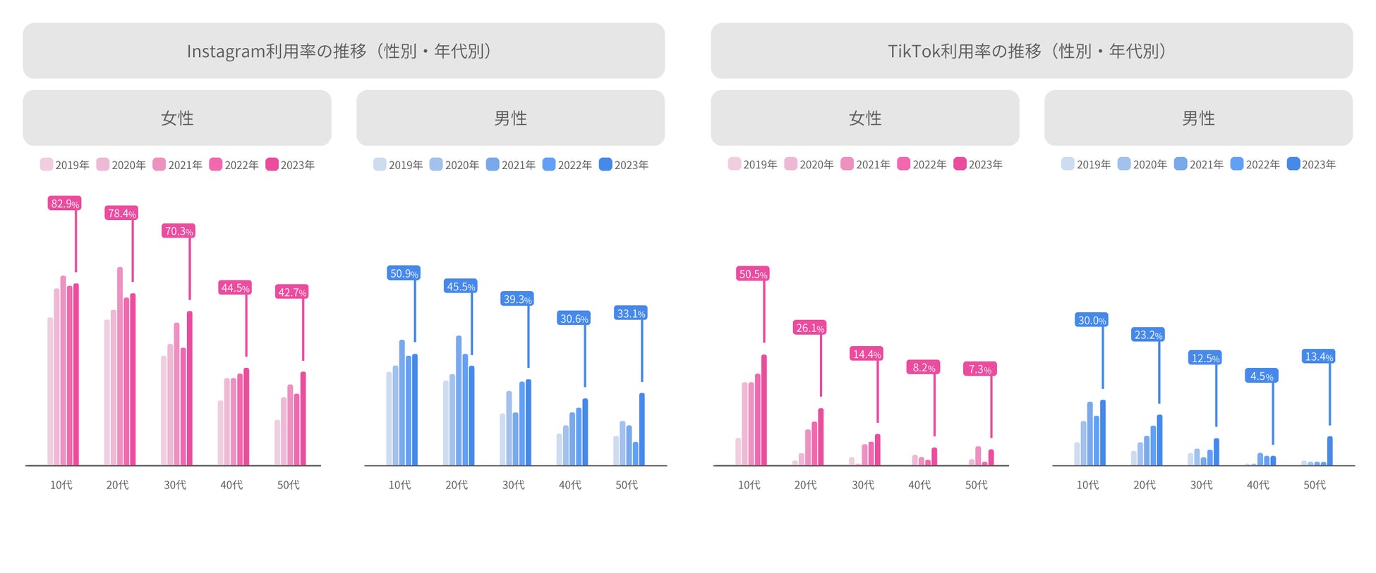 「Instagram」と「TikTok」の利用率を年代別・性別で比較すると「Instagram」は女性30代、50代、男性50代と比較的高い年代の利用率が伸びていますが、一方で「TikTok」は男性40代を除く全ての性年代で伸びていて、幅広い層に支持され始めていることが分かります。