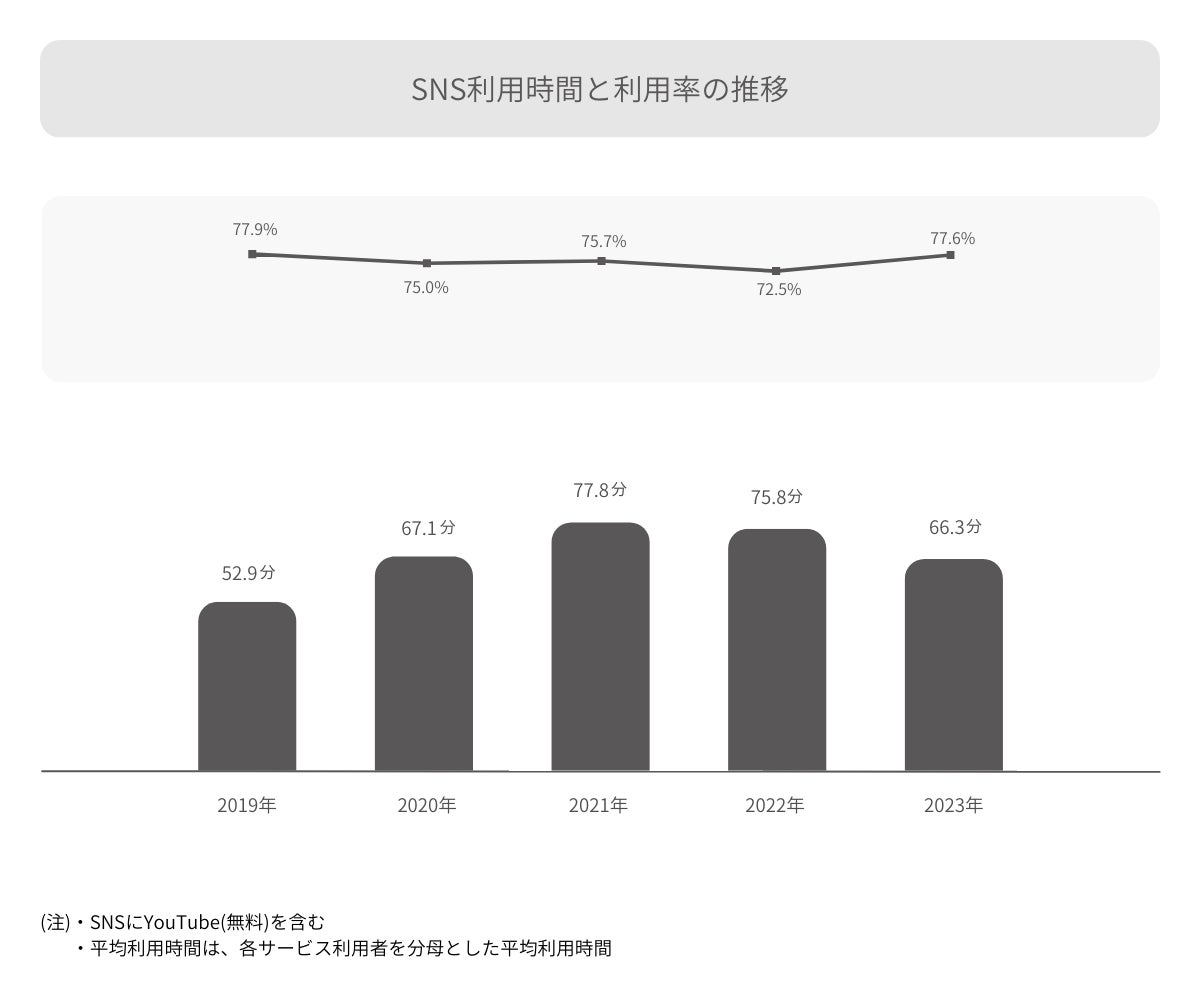 SNSの利用率は、2022年と比較し5.1ポイント上昇。2019年に近い水準まで回復しました。
