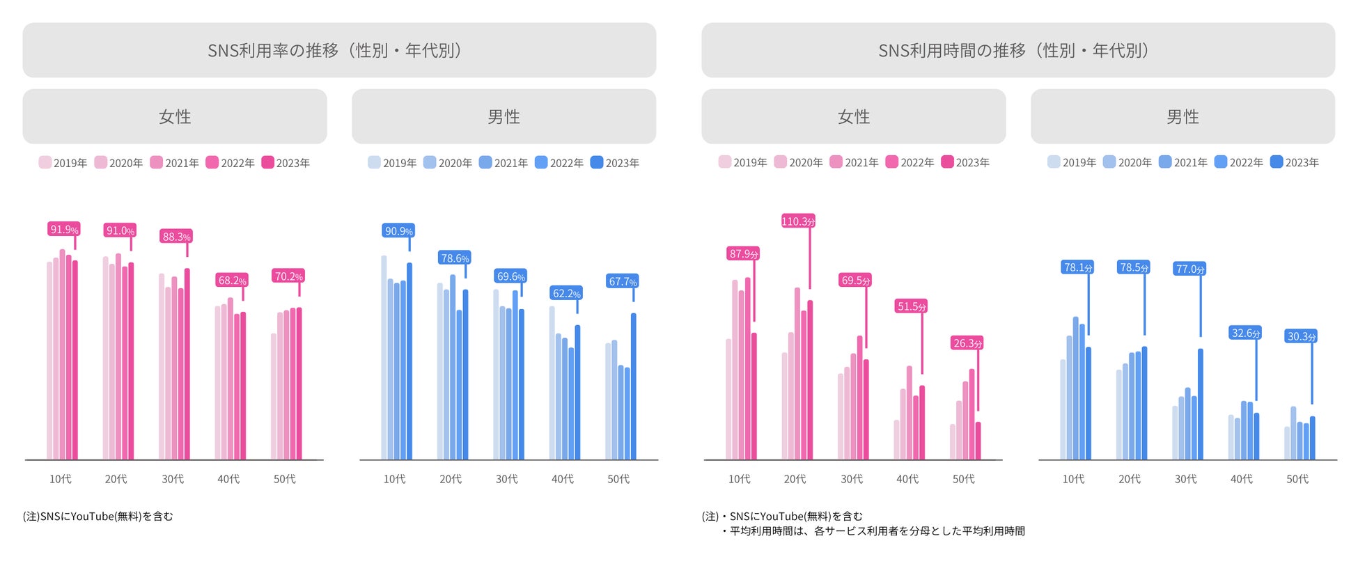 SNSの利用時間は、15~19歳で大幅に減少しました。新型コロナウィルス感染症対策の緩和が進み、SNSでのコミュニケーションからリアルコミュニケーションへと、時間の使い方の変化が最も大きく現れた年代であると思われます。