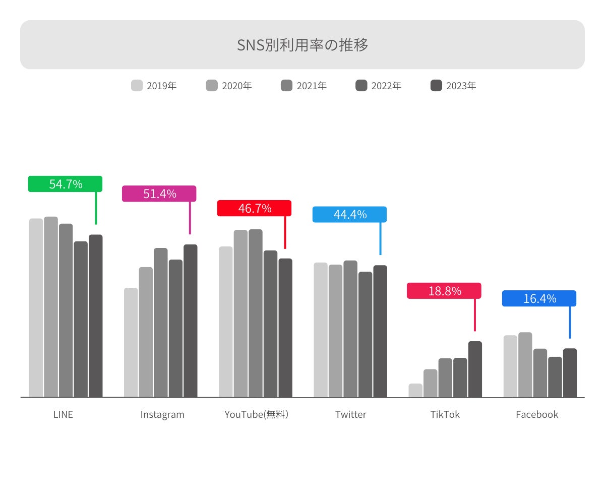 「LINE」、「Instagram」、「YouTube(無料)」、「Twitter」、「TikTok」、「Facebook」の利用状況をみると、「TikTok」が利用率を伸ばし、2022年の13.2%から2023年は18.8%へと上昇しました。「Instagram」も2022年の46.3%から2023年51.4%と5.1ポイント上昇しています。