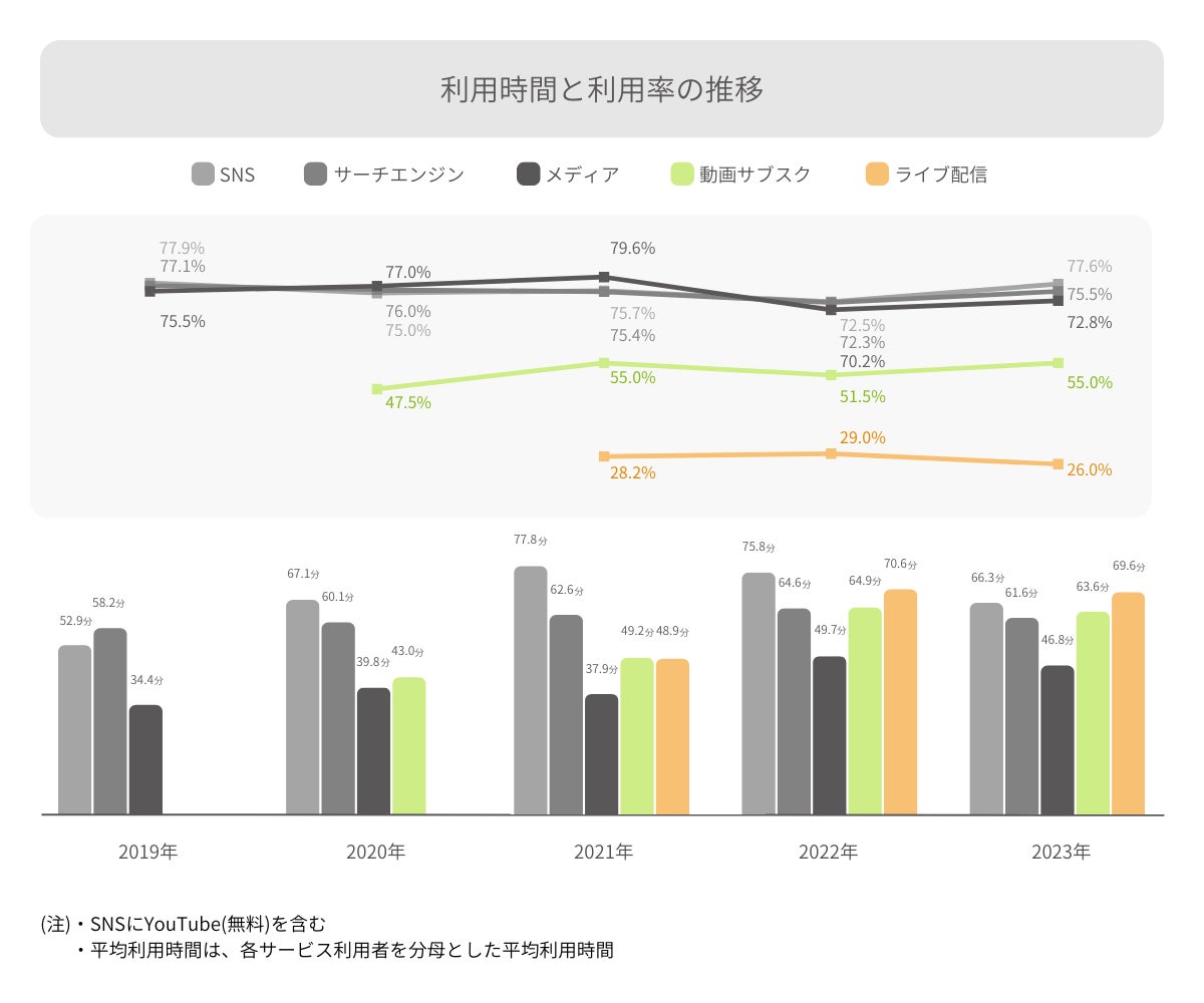 ▼利用時間と利用率の推移_「SNS」、「サーチエンジン」、「メディア」、「動画サブスク」、「ライブ配信」