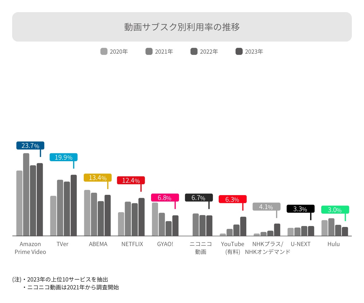 ▼動画サブスク別利用率の推移_[Amazon Prime Video」、「TVer」、「ABEMA」、「NETFLIX」、「GYAO!」、「ニコニコ動画」、「YouTube(有料)」「NHKオンデマンド/NHKプラス」、「U-NEXT」、「Hulu」