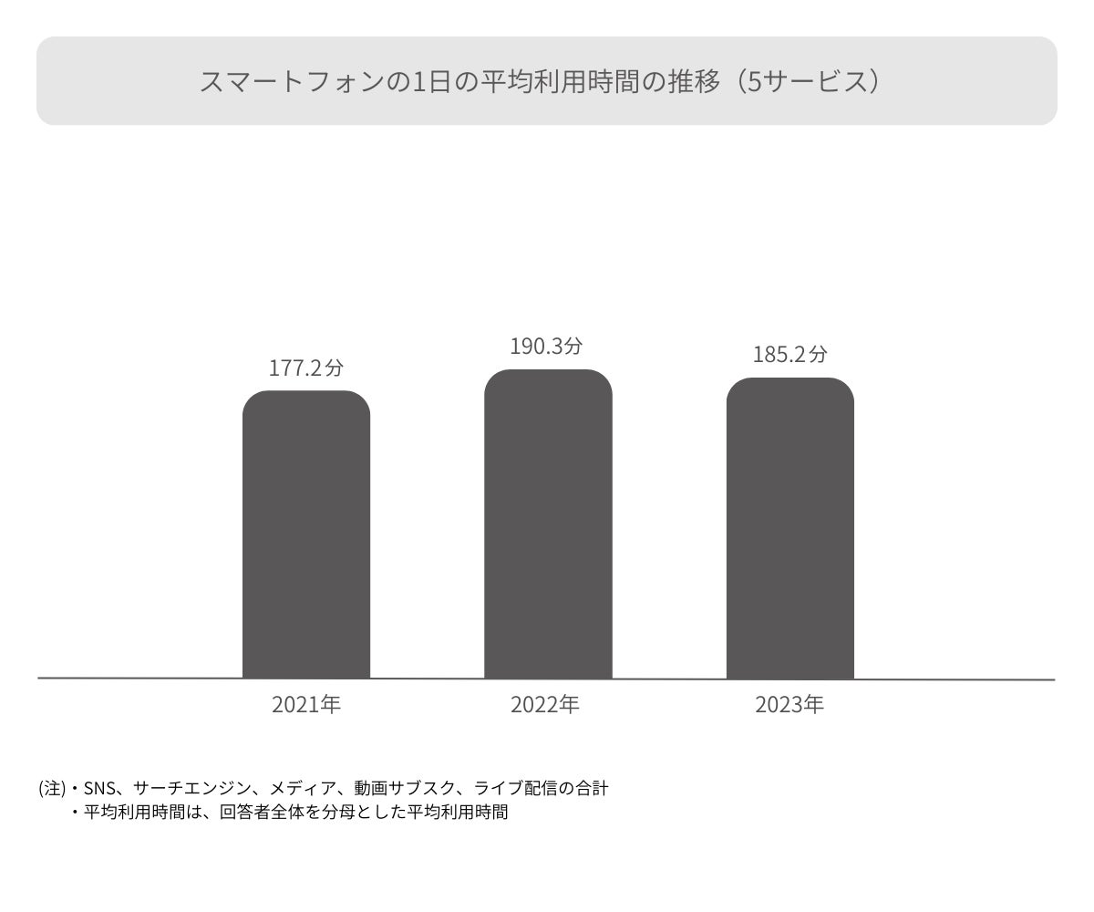 2021年より前述の3分類「SNS」、「サーチエンジン」、「メディア」に、「動画サブスク」、「ライブ配信」を加えた5分類のサービス利用状況も調査していますが、5分類合計の1日の平均利用時間も2022年から2023年にかけて「190.3分」から「185.2分」と減少しています。