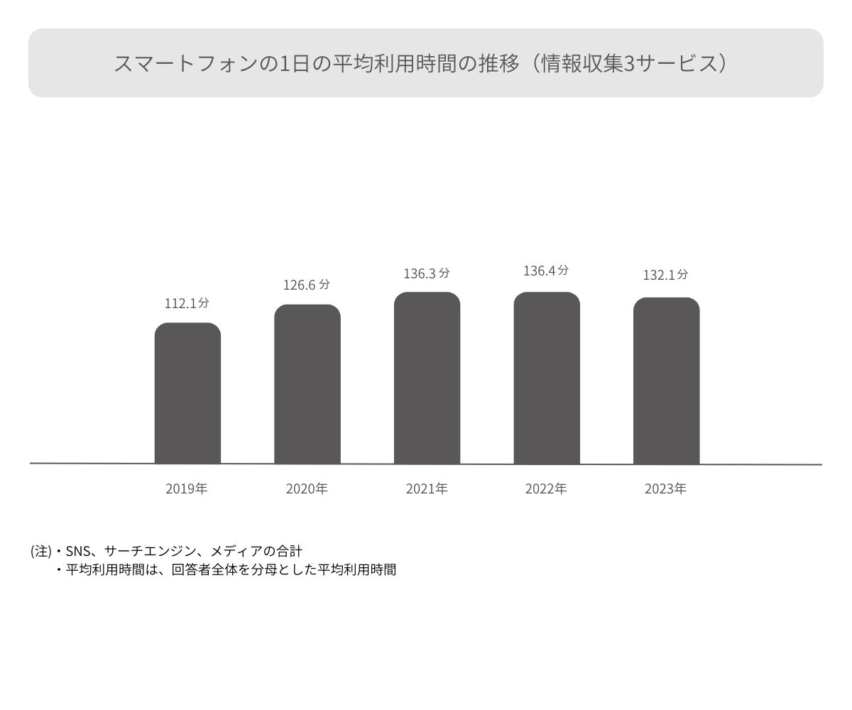 スマートフォンでの情報収集を「SNS」、「サーチエンジン」、「メディア」の3分類に分け経年で利用状況を見ていますが、2022年の調査時点で、3分類合計の1日の平均利用時間は2021年から横ばいになり、"頭打ち"を迎えたと予想していました。2023年の調査では、2022年から2023年にかけて「136.4分」から「132.1分」と減少し、"頭打ち"である状況が明確になりました。