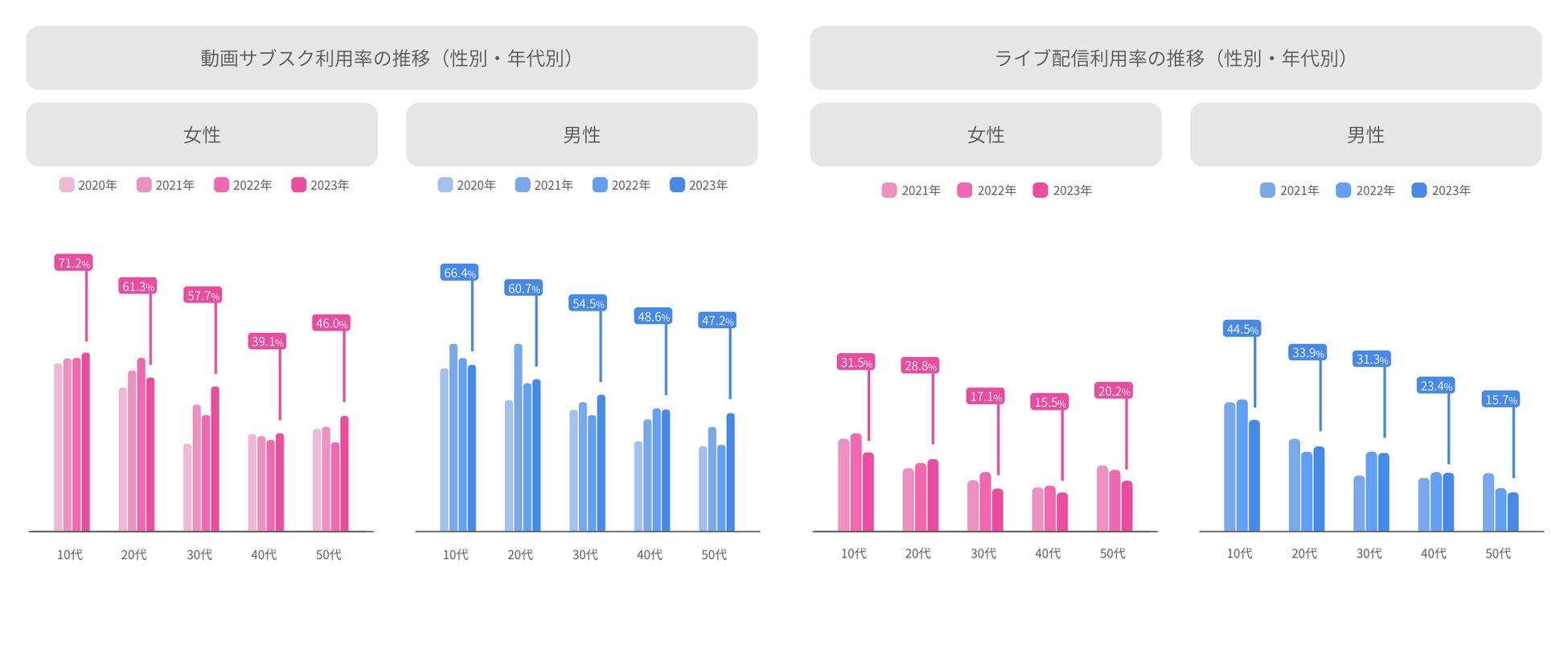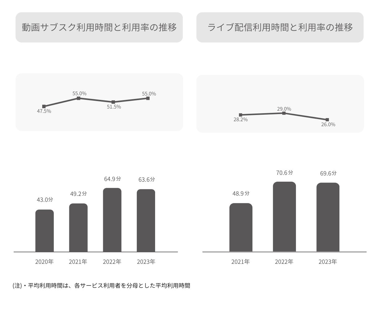 動画サブスクの利用率は、2022年に低下したものの2023年は55.0%と2021年水準に戻りました。一方でライブ配信は、2022年の29.0%から2023年の26.0%と3.0ポイント減少し、動画サブスクとライブ配信で明暗が分かれました。