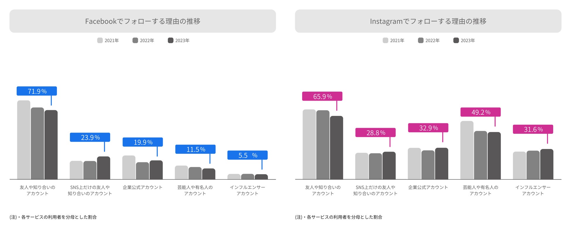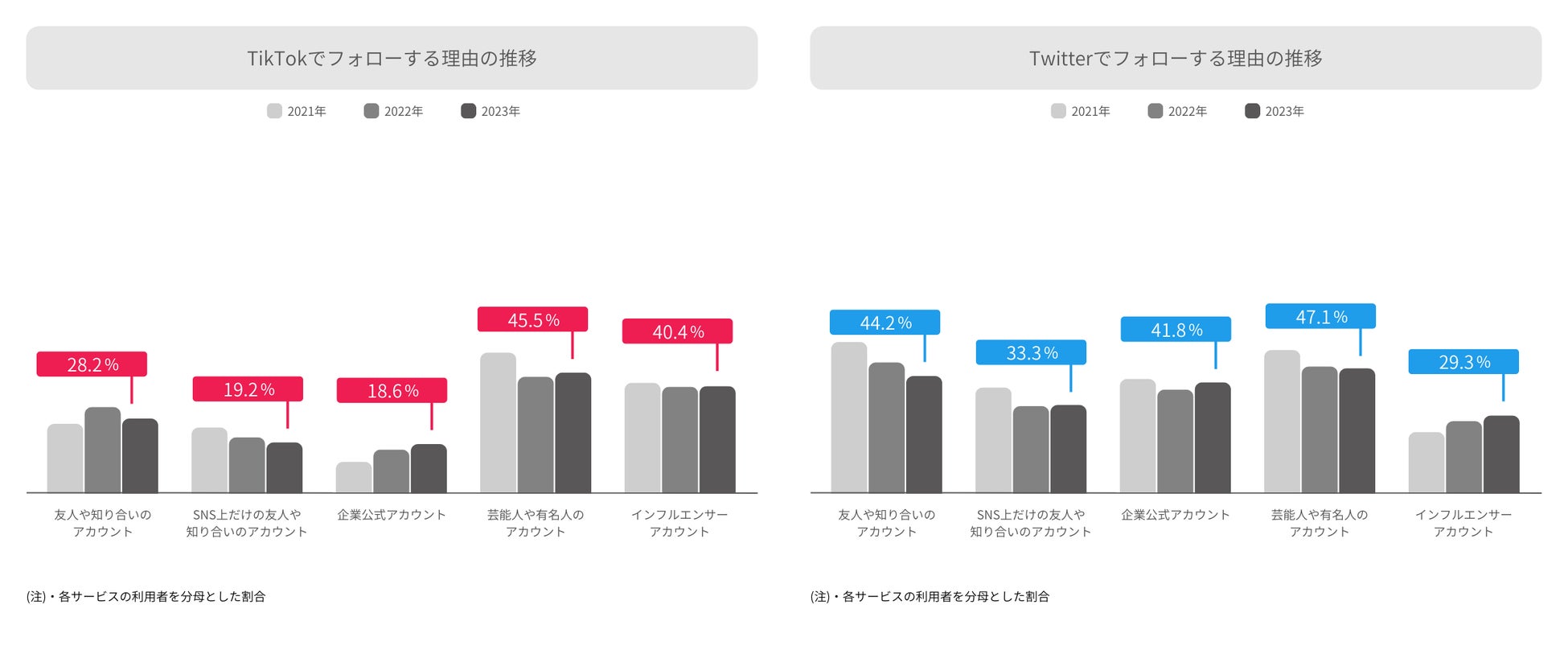 SNSの使われ方にも変化が起きており、SNSでアカウントをフォローする理由として比較的高い「友人や知り合いのアカウント」のフォロー率は、2022年と比較して、「Facebook」、「Instagram」、「TikTok」、「Twitter」のいずれのサービスでも低下しています。一方で「企業公式アカウント」や「インフルエンサーアカウント」のフォロー率は上がっており、友人や知り合いの近況を確認するツールとしてではなく、自分に合った有益な情報を得るためのツールとしての使われ方へと変わってきている可能性があります。