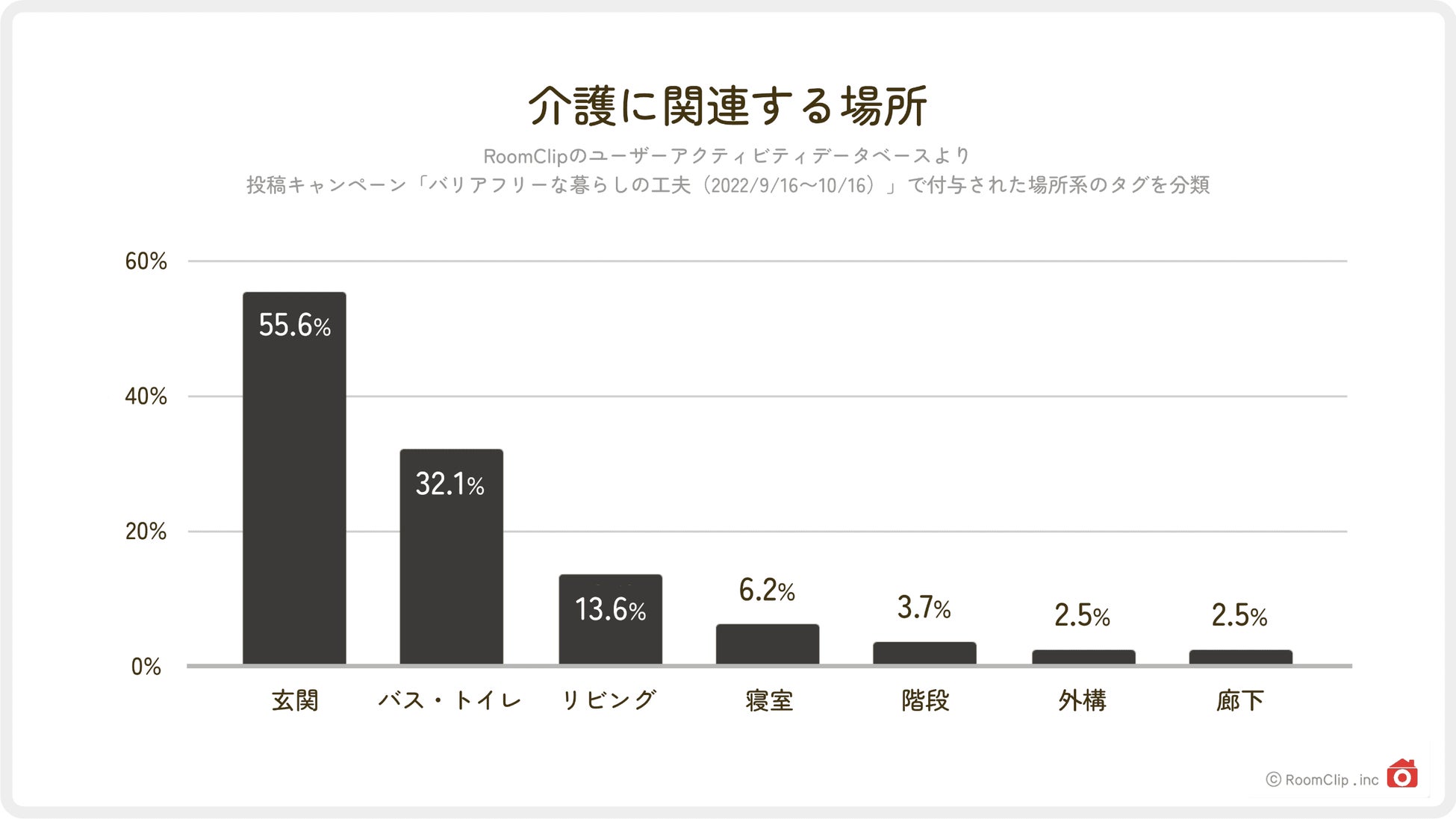 2022年9月にRoomClipで実施した「バリアフリーな暮らしの工夫」という投稿イベント(RoomClipが掲げたテーマに関する投稿を募る企画)に集まった写真の、付与されたタグを場所別に計測してみました。