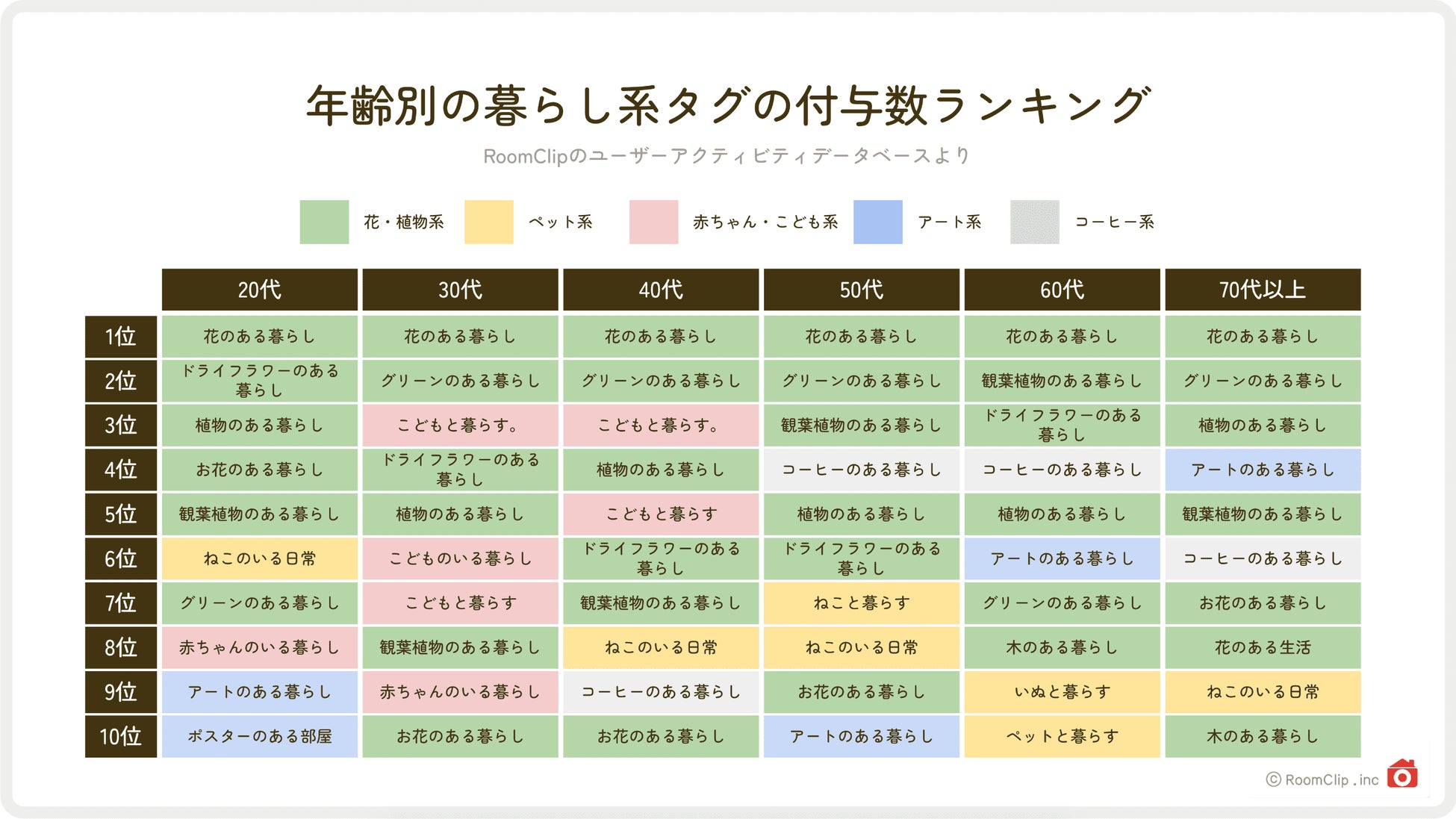 上図は、RoomClipに登録されているユーザーのプロフィール情報を元に、年代別「暮らし系タグ」の付与数を、10位までのランキング形式で表したものです。 どの年代においても植物や花関連のタグが最も高い割合を占めていて、人気の高さを伺わせます。