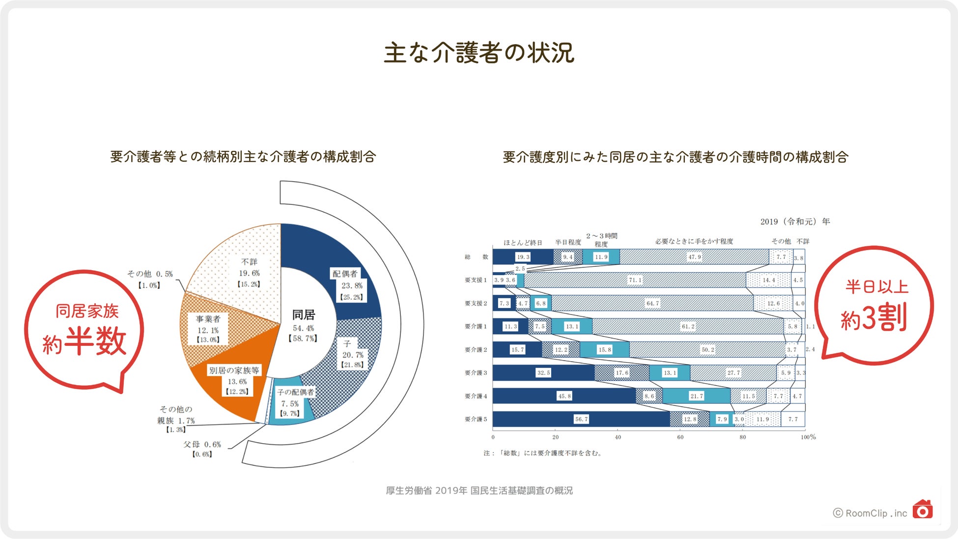 要介護(要支援者)認定数も増加しています。厚生労働省による「令和2年度 介護保険事業状況報告(年報)」では、令和3年は前年比で13万人増となっていることが報告されています。 では、実際に介護を行っているのは誰なのでしょう?少し前のデータになりますが、同じく厚生労働省が発表した「2019年 国民生活基礎調査の概況」によると、半数以上が同居している家族で、別居している家族も加えると、介護者の8割近くが何らかの親族であることがわかります。事業者が占めている割合は1割程度という結果です。一日における介護時間の割合も、要介護度数の上昇に比例して増加しており、要介護3の時点で半日以上介護に費やす介護者が3割以上にのぼることがわかります。