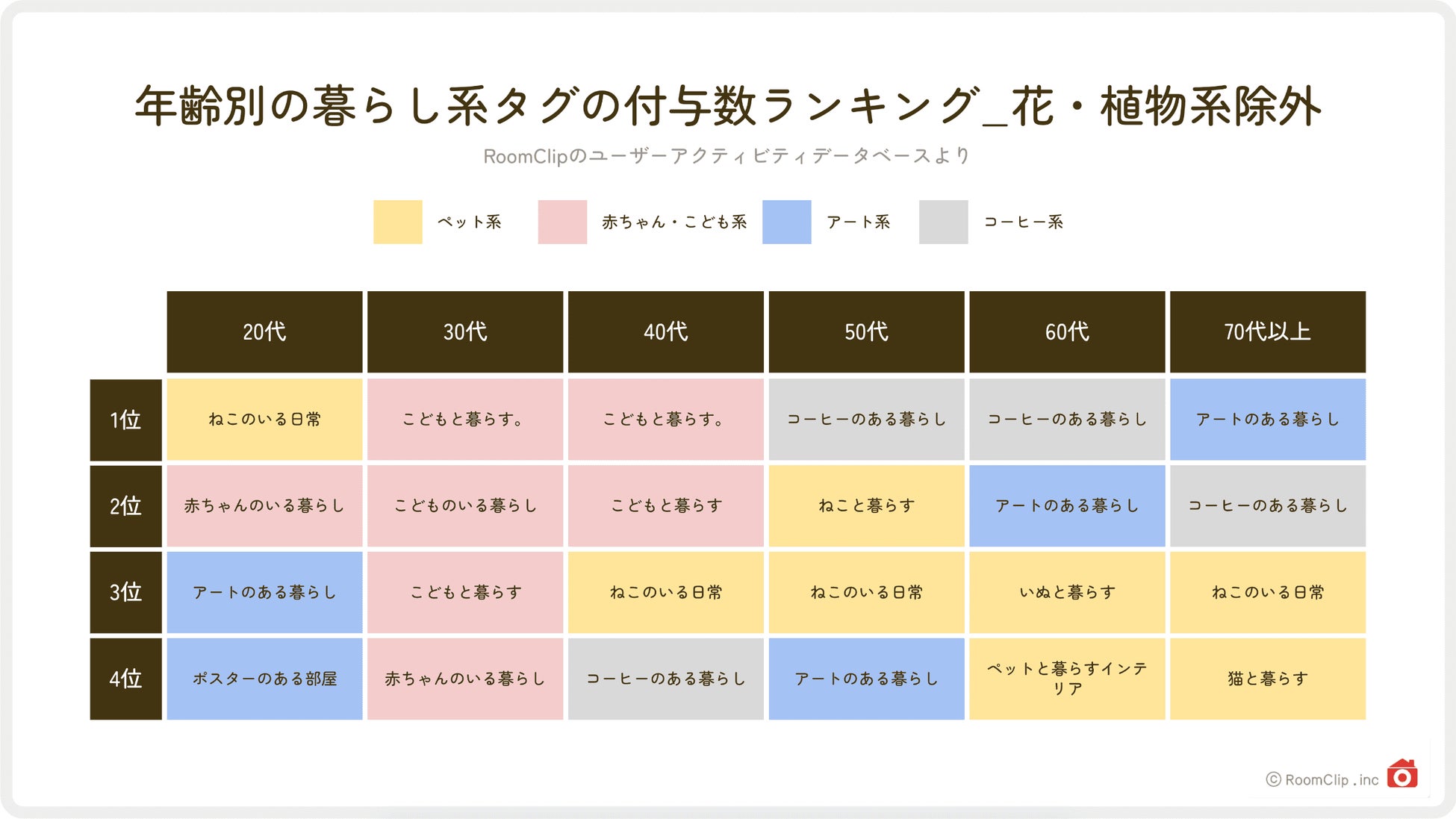 すると、30〜40代は子供や赤ちゃん関連のタグが多く、50代以上になると子供関連のタグは消え、ペット・アート・コーヒー関連のタグが上位に上がっていることがわかります。ちなみにこれらのタグは、50代以下の年代ではどれも10位以下です。