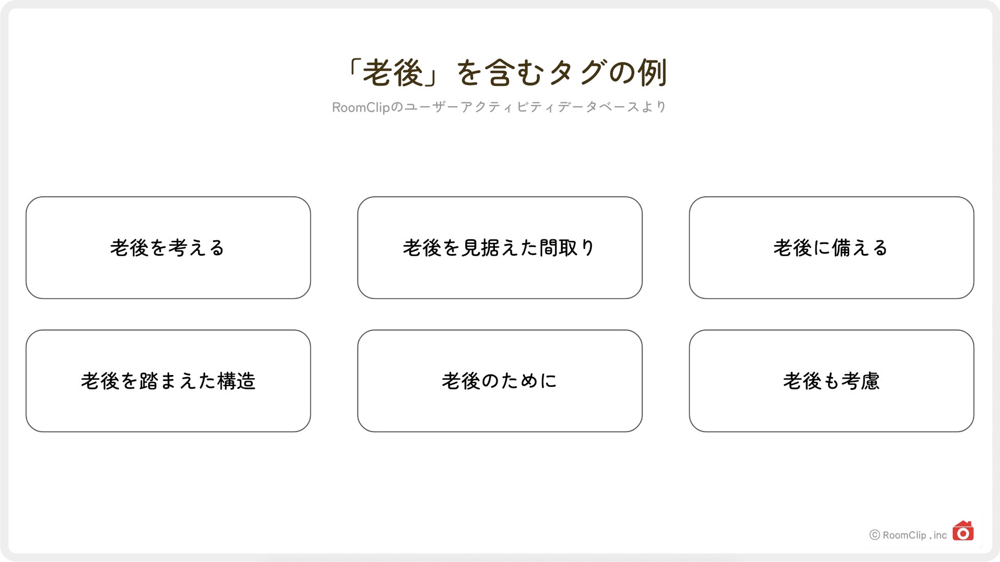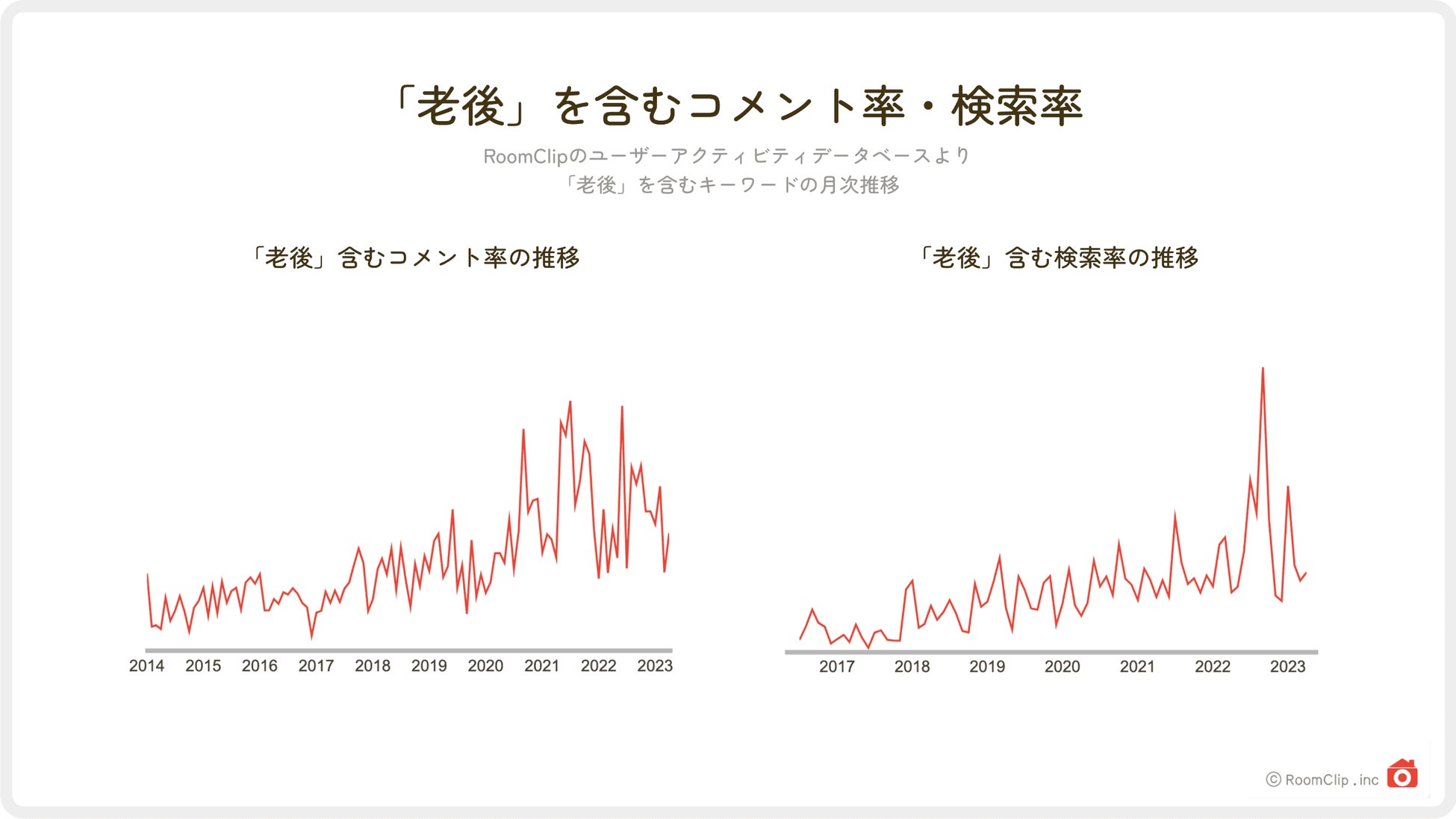 1:高齢者世帯の増加と伸び続ける寿命 内閣府が発表した「令和3年版高齢社会白書 3家族と世帯」によると、65歳以上の者を含む世帯は49.4%と約半分。また、同じく内閣府の 「令和4年版高齢社会白書(全体版)2 健康・福祉」によると、男女問わず平均寿命・健康寿命ともに伸び続けています。 2:介護を含む検索率は5年で1.82倍に増加(※) 「介護」のキーワードは、RoomClipにおいてコメント付与率・検索率ともに上昇傾向。コメント付与率の推移からは「介護」に関する話題が増えていること、検索率の推移からは関心度が高まっていることが伺えます。 3:インテリアと介護の両立に取り組む生活者の姿が浮き彫りに RoomClip全体で「介護」というキーワードを含む、投稿数の多いタグに共通するのは「インテリアとの両立」という視点。実際の投稿を見ても「暮らしやインテリアになじむ介護設備」を目指す、前向きな試行錯誤の様子が伺えます。 4:「老後」を含む検索率も5年で2.53倍に増加(※) 「老後」を含むタグのうち投稿数の多いタグは「老後を考える」「老後を見据えた間取り」「老後に備える」など。リフォームや新築などの場面で、自身の老後を考慮した家づくりを行っている生活者たちの姿が浮かび上がってきます。 5:子育て以前の趣味や好きなことがアクティブシニアの関心ごとに RoomClip登録ユーザーの年代別に「暮らし系」タグの付与数をランキング形式で表すと、50代以上は子ども関連のタグが消え、ペット・アート・コーヒー関連のタグが上位に。「コーヒーのある暮らし」を除くと、50代以降のランキングは20代のそれとほぼ同じ結果となりました。 |