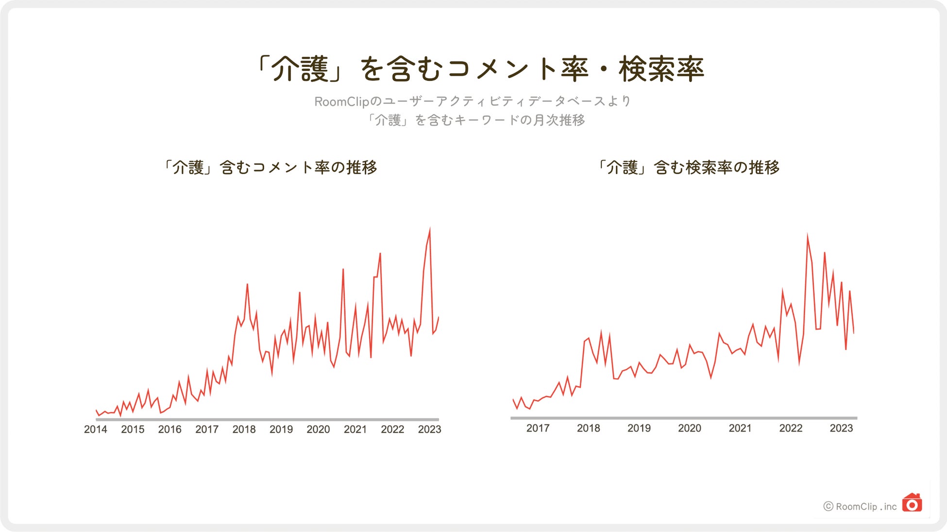 まず、「介護」というキーワードにおけるコメント率と検索率を調査してみました。「コメント」とは、ユーザーが自身の投稿をアップする際に添えたコメントと、投稿に寄せられたフォロワーによるコメントの両方を含みます。コメント率・検索率ともに上昇傾向なのがわかります。コメント率の推移からは「介護」というキーワードに関する話題が増えていること、検索率の推移からはこれらのトピックへの関心度が高まっていることが伺えます。