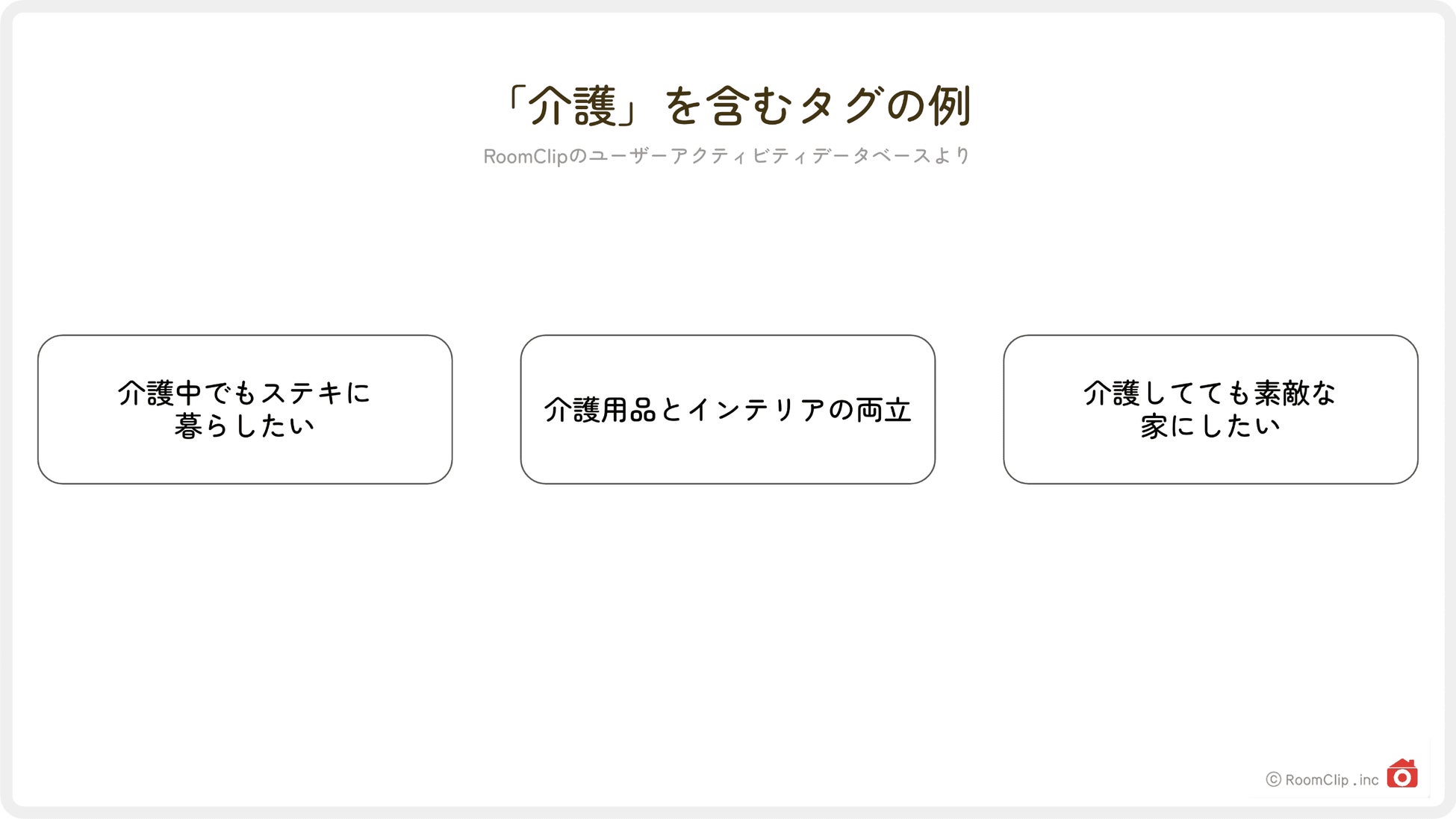 そんな彼らが今後10年で直面するであろうライフステージが「介護」です。健康寿命の延伸や年金受給年齢の引き上げなどの社会的状況も相まって、これまでの世代と比べてより長く働く世代になるため、10年後は介護の場面においても「従来通りのやり方では立ち行かない」と頭を抱える人が今よりも増えることが予想されます。これまで家事や育児の場面で暮らしのペインを減らす工夫を重ねてきたこの世代が「シニアの暮らし」にどうアプローチしていき、どんな発信をしていくのか。RoomClipは今後も注目していきます。