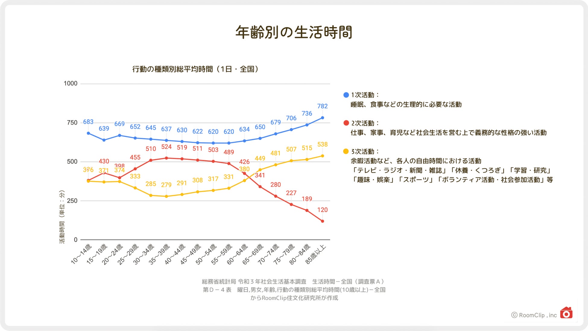毎日の活動を1次(睡眠や食事などの生理的に必要な活動)・2次(仕事・家事・育児などの義務的な活動)・3次(余暇活動)の3種類に分け、年齢別の各活動に費やす時間を表したのが上のグラフです。
