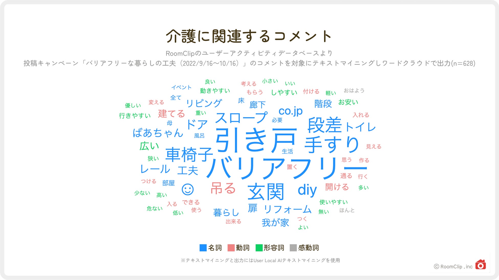 さらに、集まった投稿に寄せられたコメントをテキストマイニングしてみると、場所以外では「引き戸」「手すり」「段差」「スロープ」や「バリアフリー」「diy」「リフォーム」というキーワードが頻出していることがわかります。実際の投稿を見てみると、普段活用している介護サポートアイテムの紹介や、どういうシチュエーションでどんな設備を利用しているかなどの詳細が伝えられています。