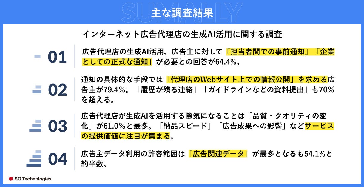 ソウルドアウト株式会社(本社:東京都文京区 代表取締役社長CEO兼CCO:荒波 修)の連結子会社であり、マーケティングテクノロジーの力で地域活性化を推進するSO Technologies株式会社(本社:東京都文京区 代表取締役:荒木 央、以下「当社」)は、インターネット広告を広告代理店に委託している広告主438人(※)を対象に、「インターネット広告代理店の生成AI活用に関する調査」を実施しました。本リリースでは、広告代理店が生成AIを活用する際の広告主への通知の必要性、広告代理店の生成AI活用時にとくに気になることや知りたいこと、生成AIに入力する広告主データの利用範囲に関する結果を紹介しています。