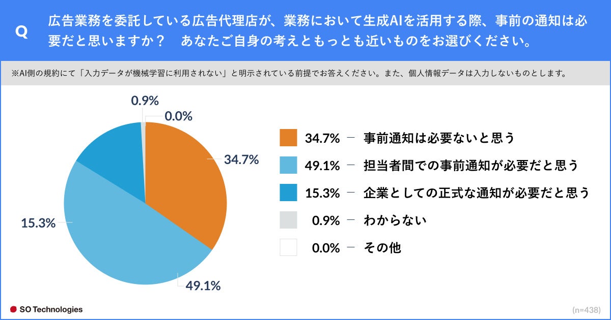 今回の調査では、広告代理店が生成AIを業務に活用する際に何らかの事前通知が必要だと考える広告主が6割以上であることがわかりました。