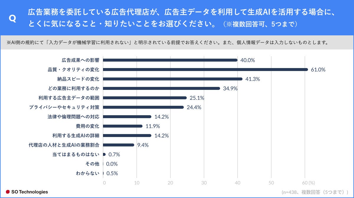 広告代理店が生成AIを活用する際に気になることは「品質・クオリティの変化」が最多で61.0%。広告サービスにおける提供価値の変化に注目が集まる。
