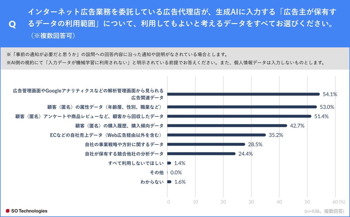 広告主データ利用の許容範囲は「広告関連データ」が最多となるも54.1%と約半数の結果に