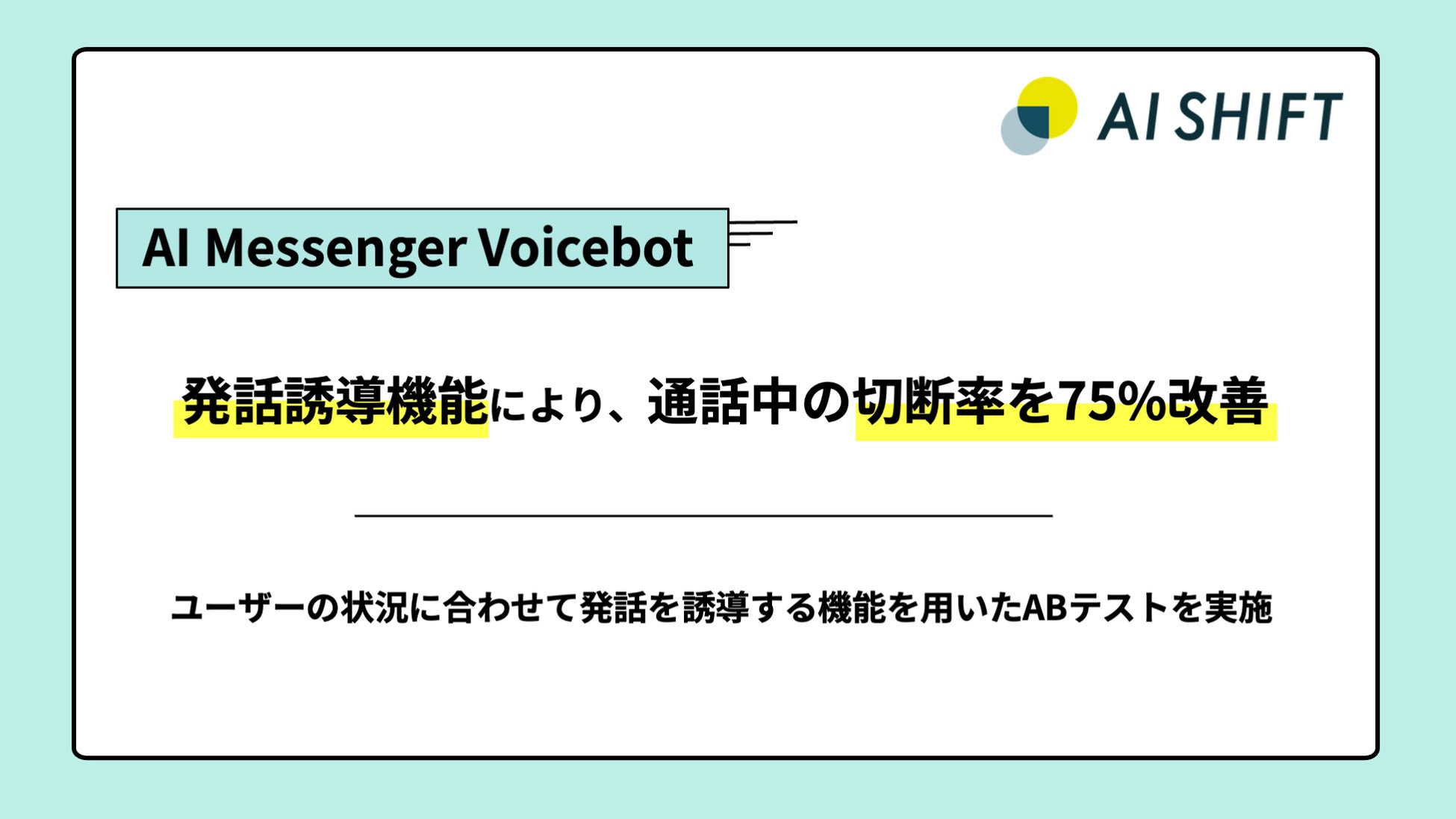 株式会社サイバーエージェント(本社:東京都渋谷区、代表取締役:藤田晋、東証プライム市場:証券コード4751)の連結子会社であるLLMのリーディングカンパニーとして対話のDXを推進する株式会社AI Shift(本社:東京都渋谷区、代表取締役社長:米山結人、以下AI Shift)は、AI自動音声対話システム「AI Messenger Voicebot」において、ユーザーの状況に合わせて発話を誘導する機能を開発し、通話中の切断率を75%以上改善したことをお知らせいたします。